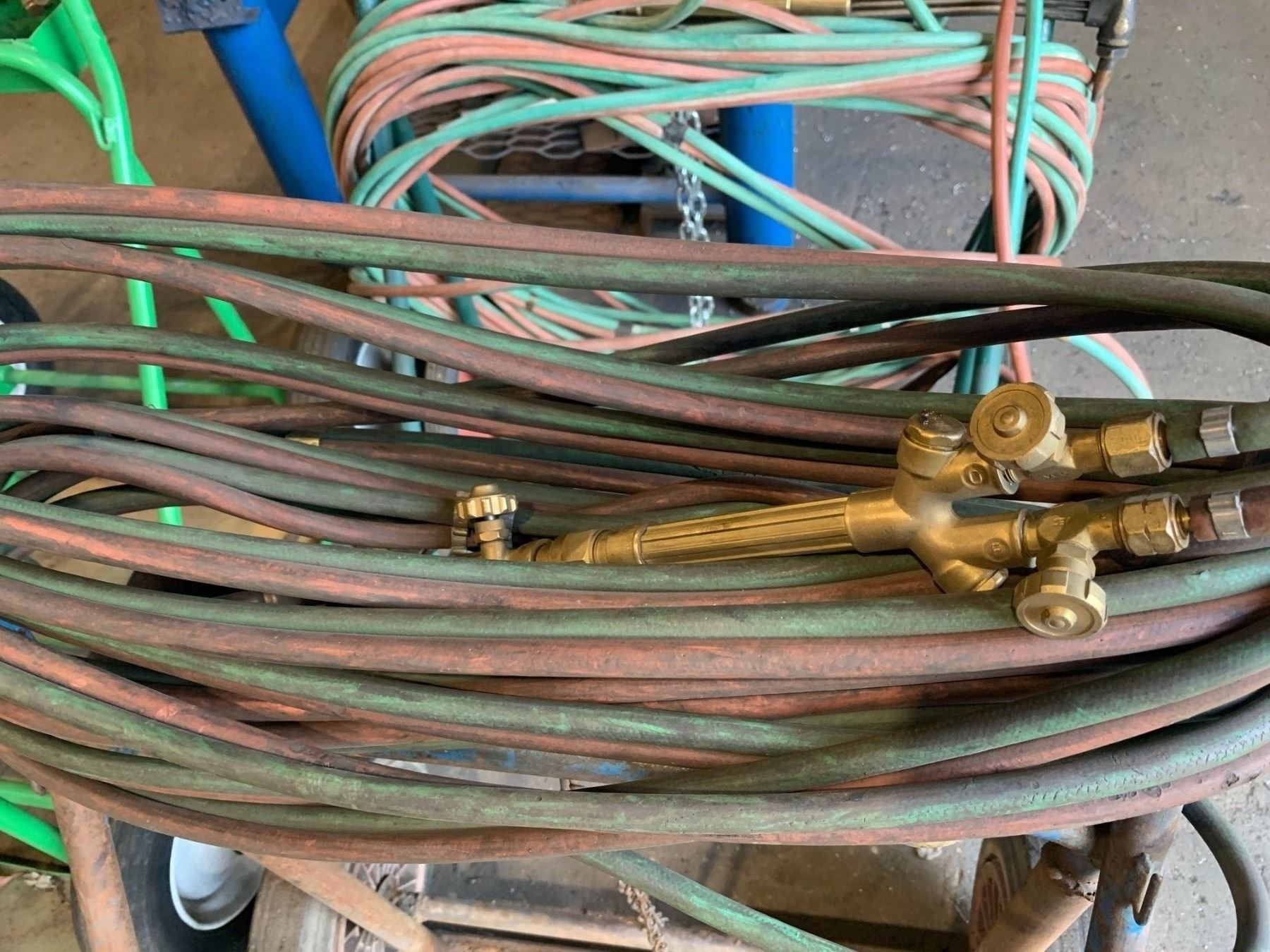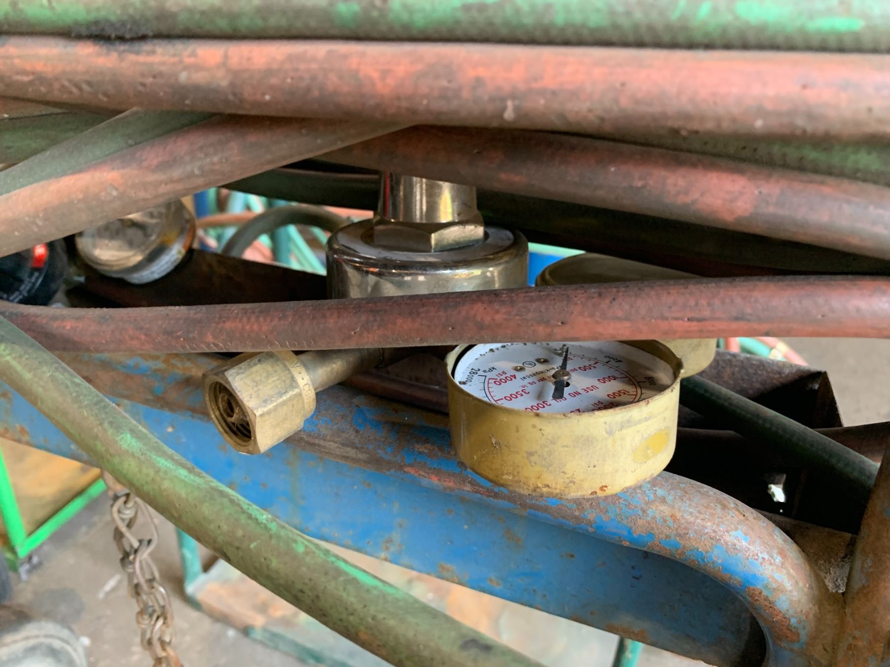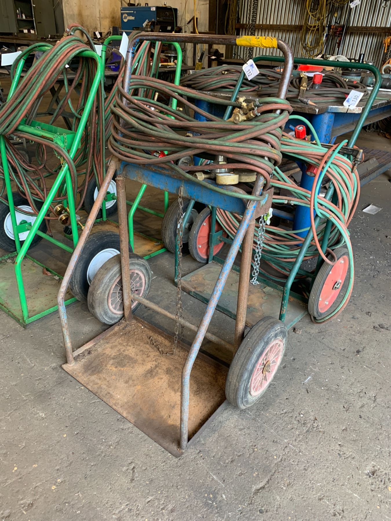 BLUE OXY ACETYLENE WELDERS DOLLY WITH TORCH, GAUGES & HOSE LINES