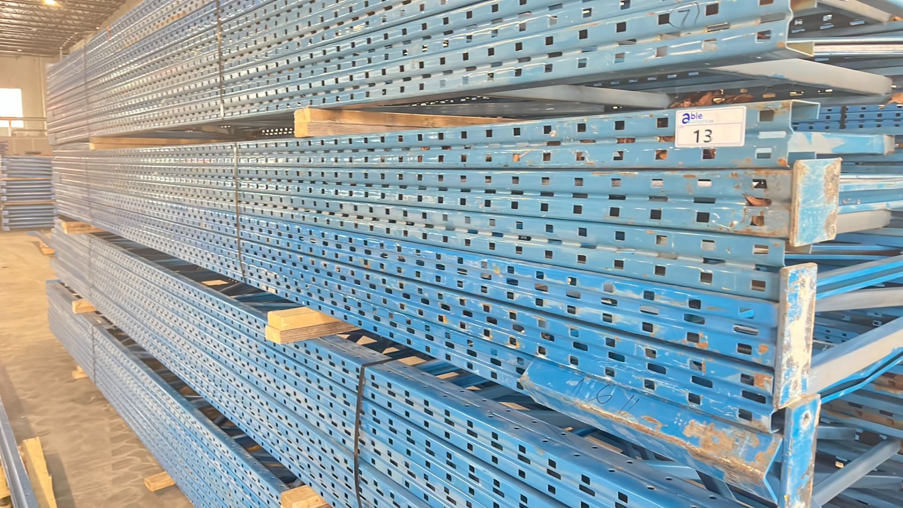 BLUE PALLET RACKING UPRIGHTS (6 PCS) APPROX. 20'H X 42"W WITH 4 1/2" X 4 1/4" (1/4") AND 7 1/4" X 3" (3/8") BASES