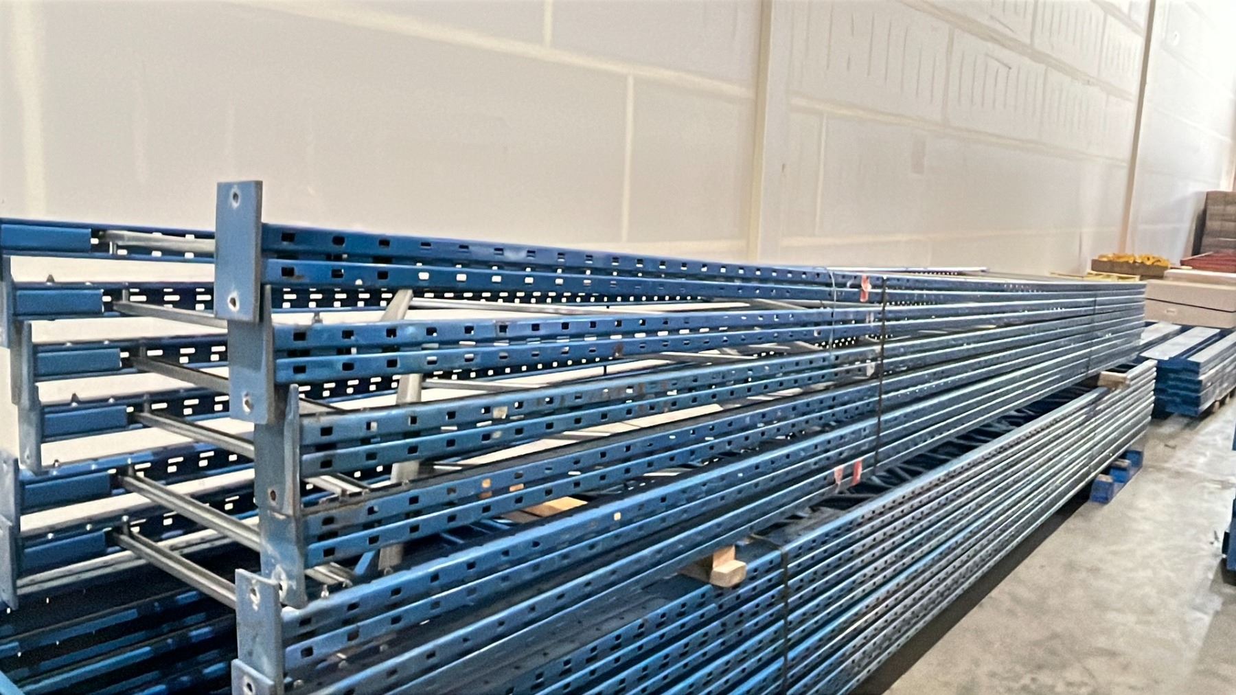 BLUE PALLET RACKING UPRIGHTS (6 PCS.) - APPROX. 20'H X 42"W WITH 4" X 7 1/4" X 3/8" BASES