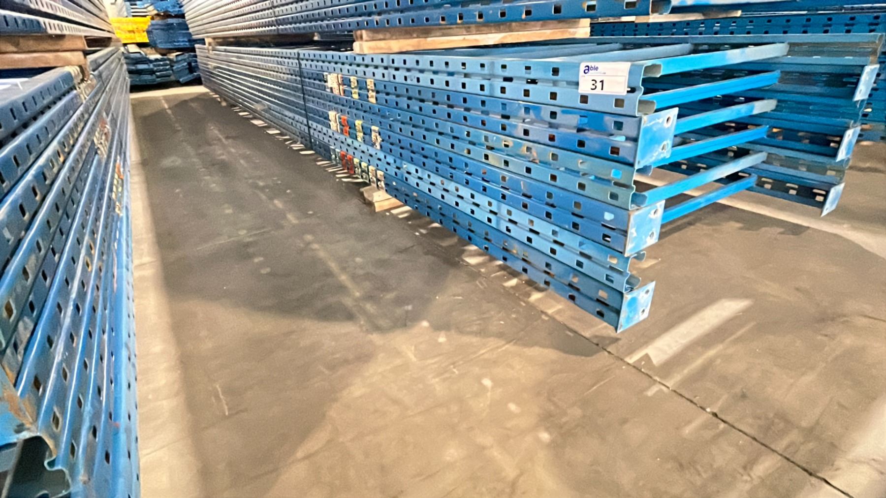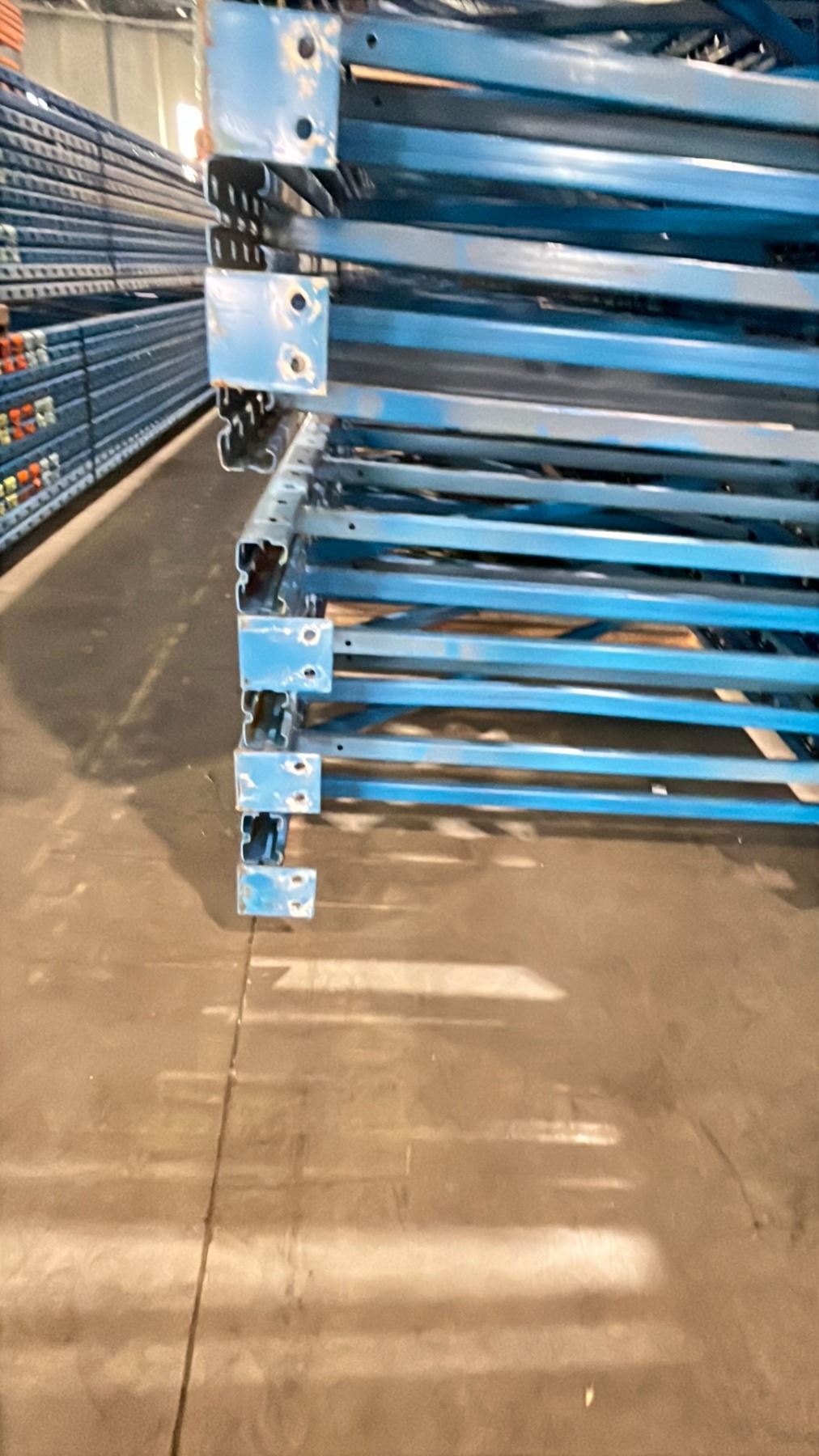 BLUE PALLET RACKING UPRIGHTS (6 PCS.) - APPROX. 21'H X 42 W WITH 4  X 3 1/2  X 1/8  BASES