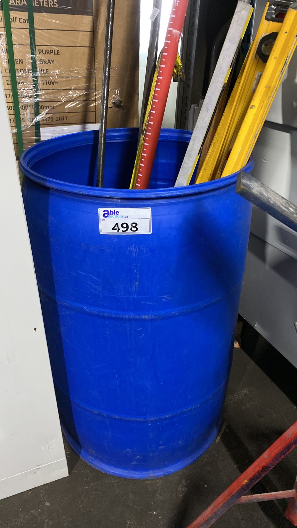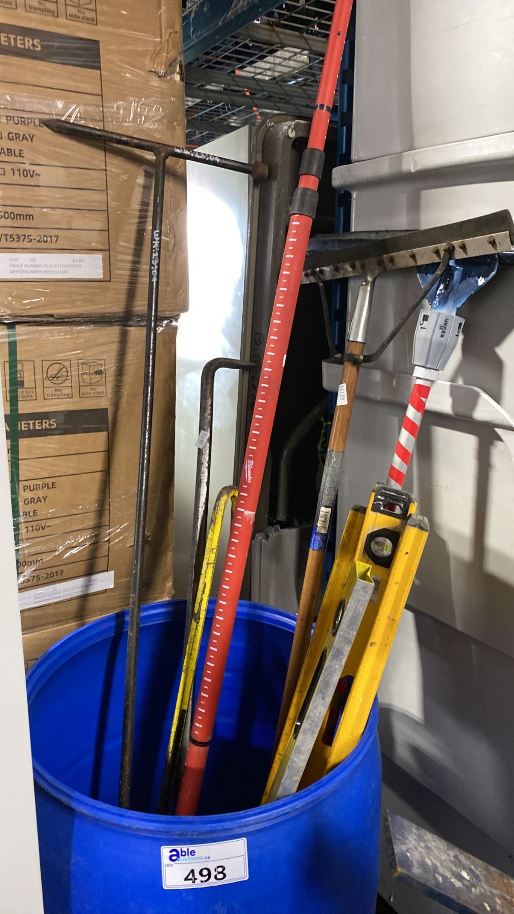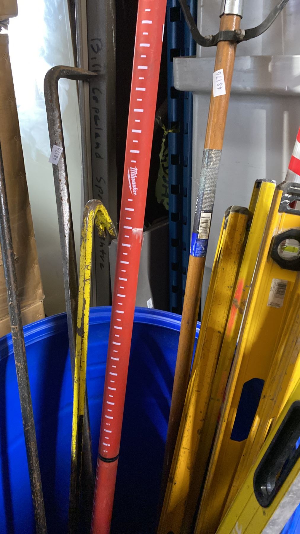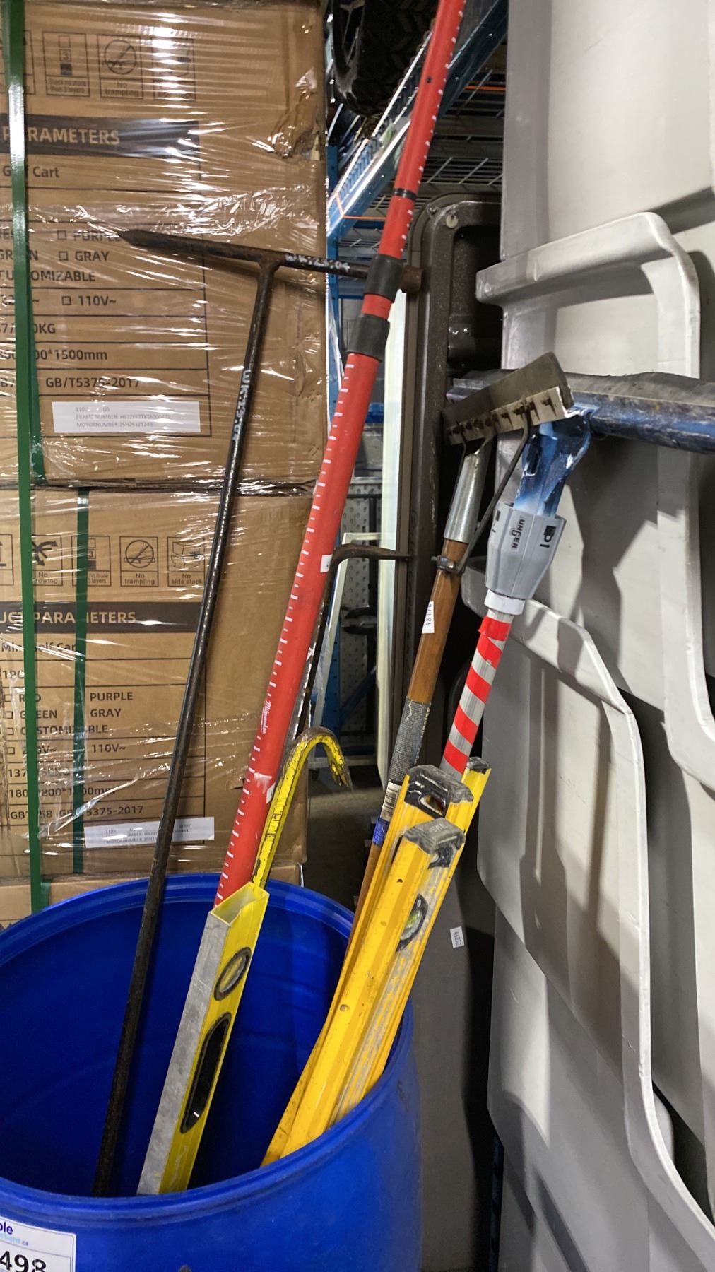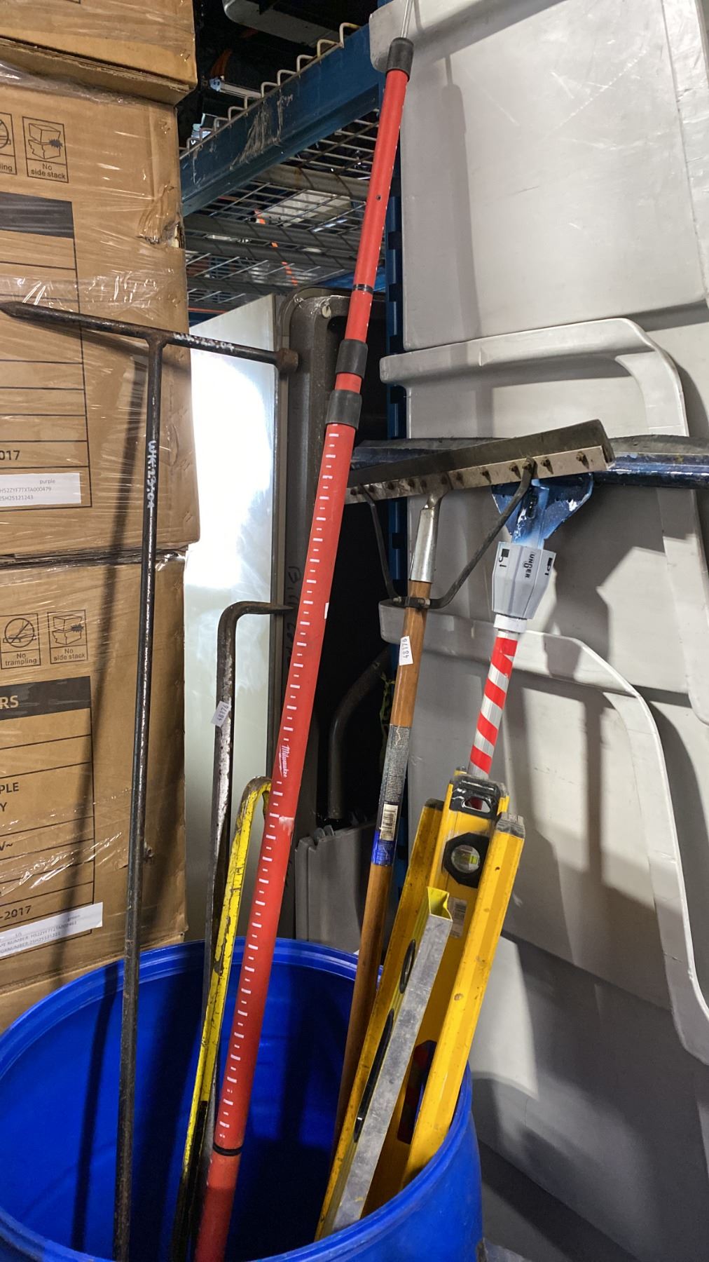 BLUE PLASTIC BARREL OF ASSORTED LEVELS, SQUEEGEES, CROWBAR, EXTENSION POLE & CUSTOM