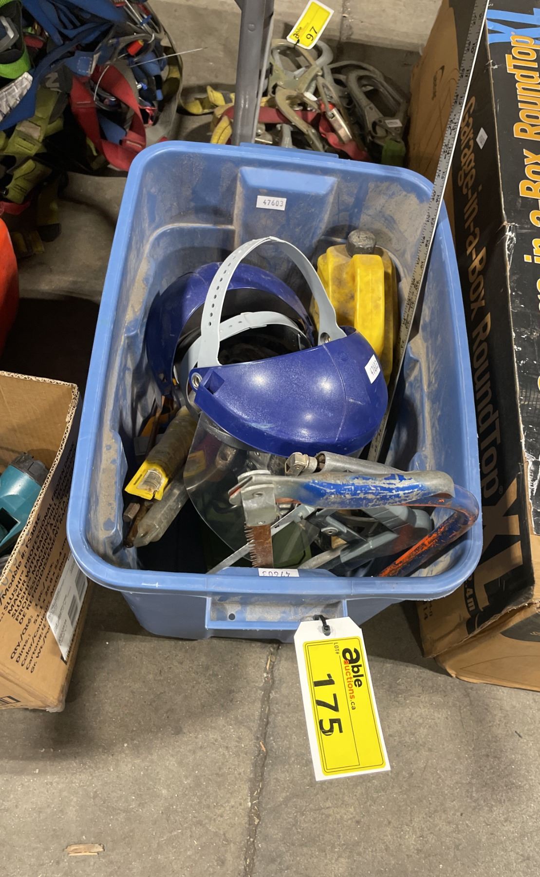 BLUE PLASTIC BIN OF ASSORTED HAND TOOLS, SAWS, CAULKING GUNS & FACE SHIELDS