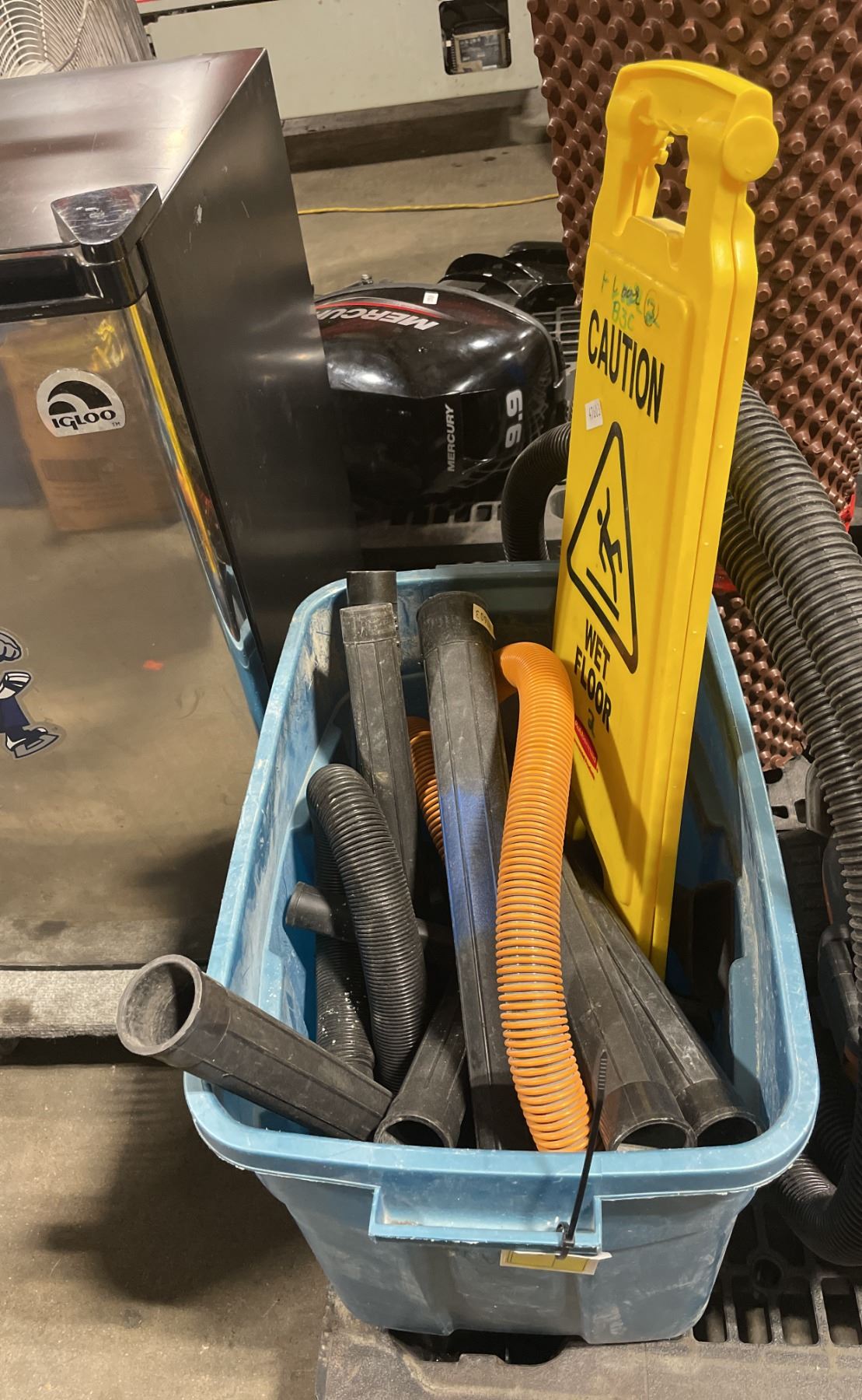 BLUE PLASTIC BIN OF ASSORTED SHOP VACUUM ATTACHMENTS & HOSES *PLASTIC BIN INCLUDED*