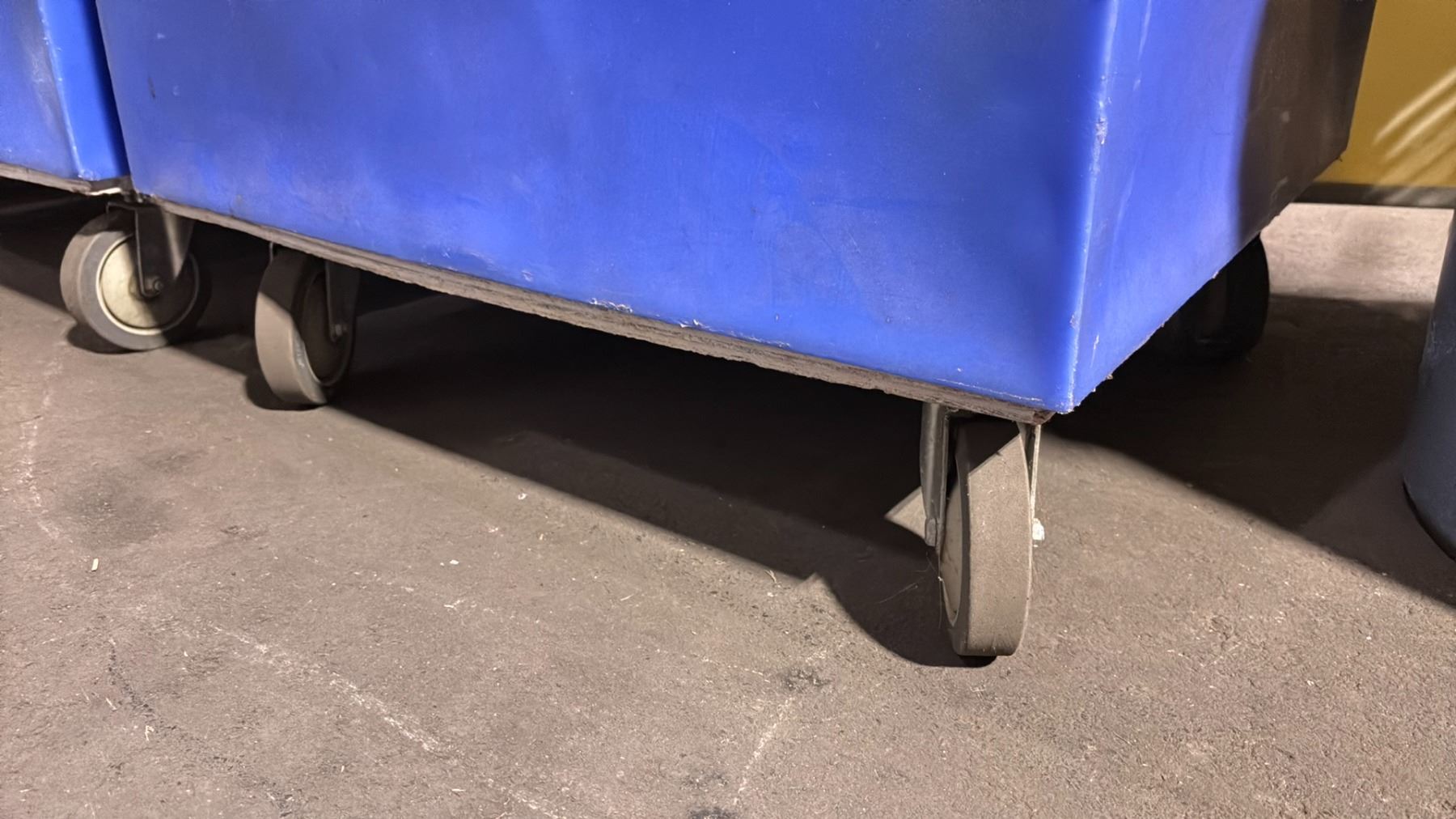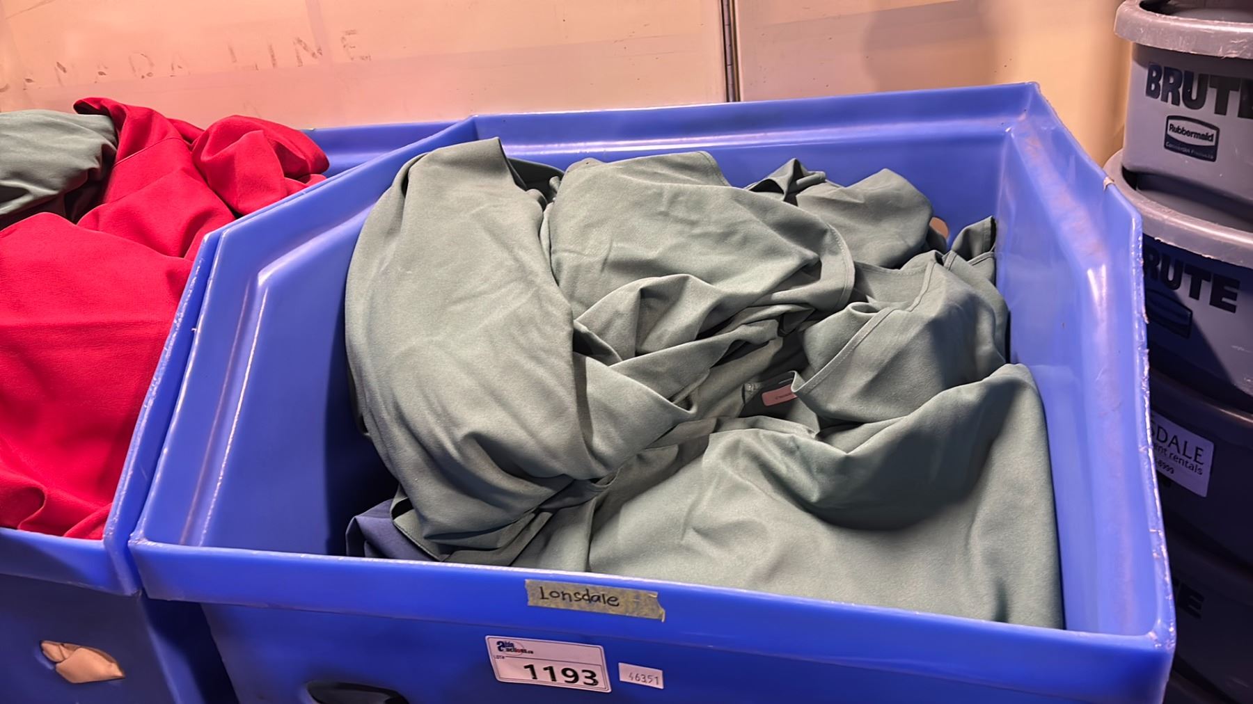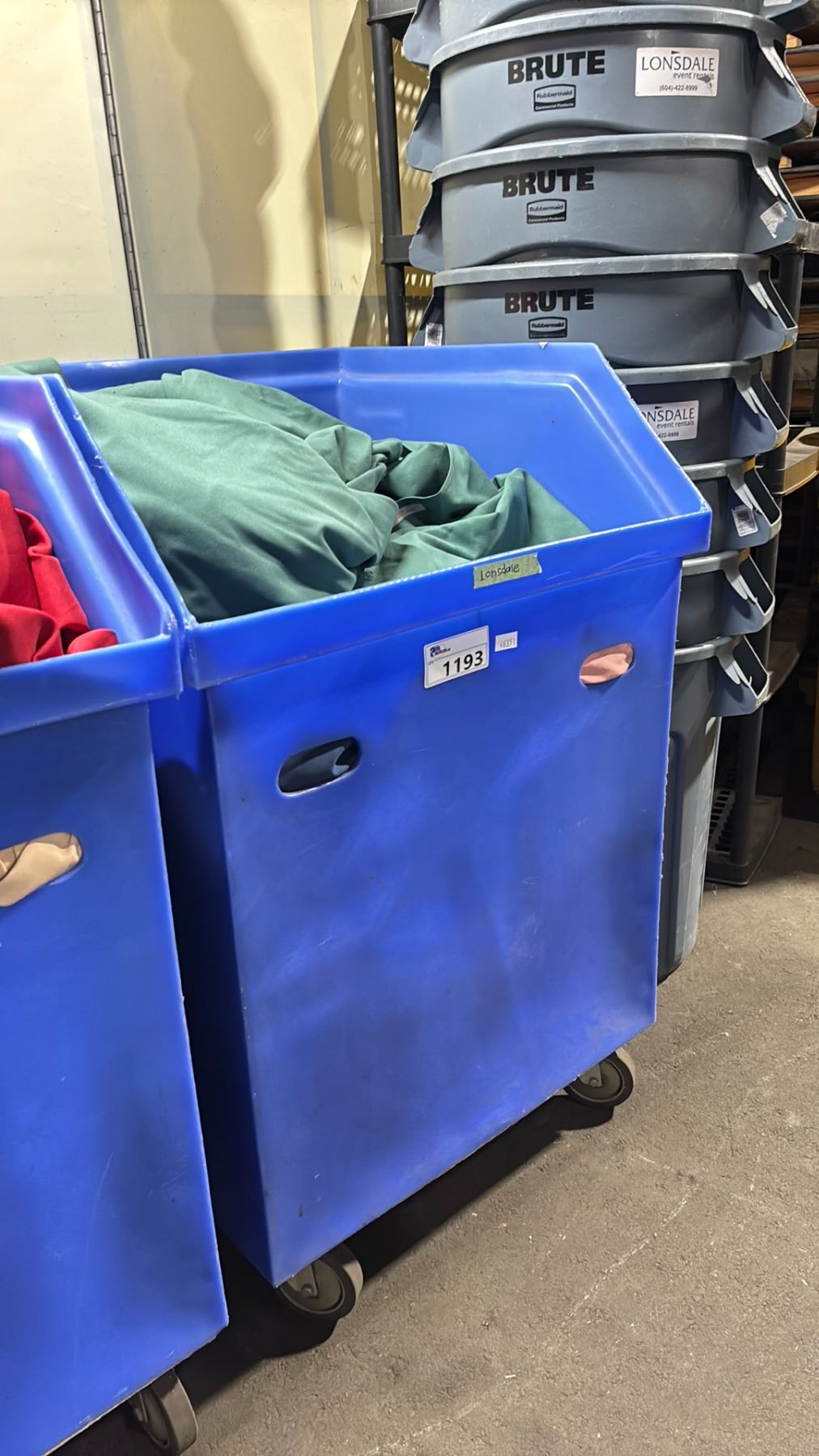 BLUE PLASTIC MOBILE EVENT CART WITH ASSORTED COLOR PROFESSIONAL EVENT / BANQUET TABLE LINENS *PLASTIC BIN INCLUDED* - BIN SIZE 31"W X 32"D X 47"H