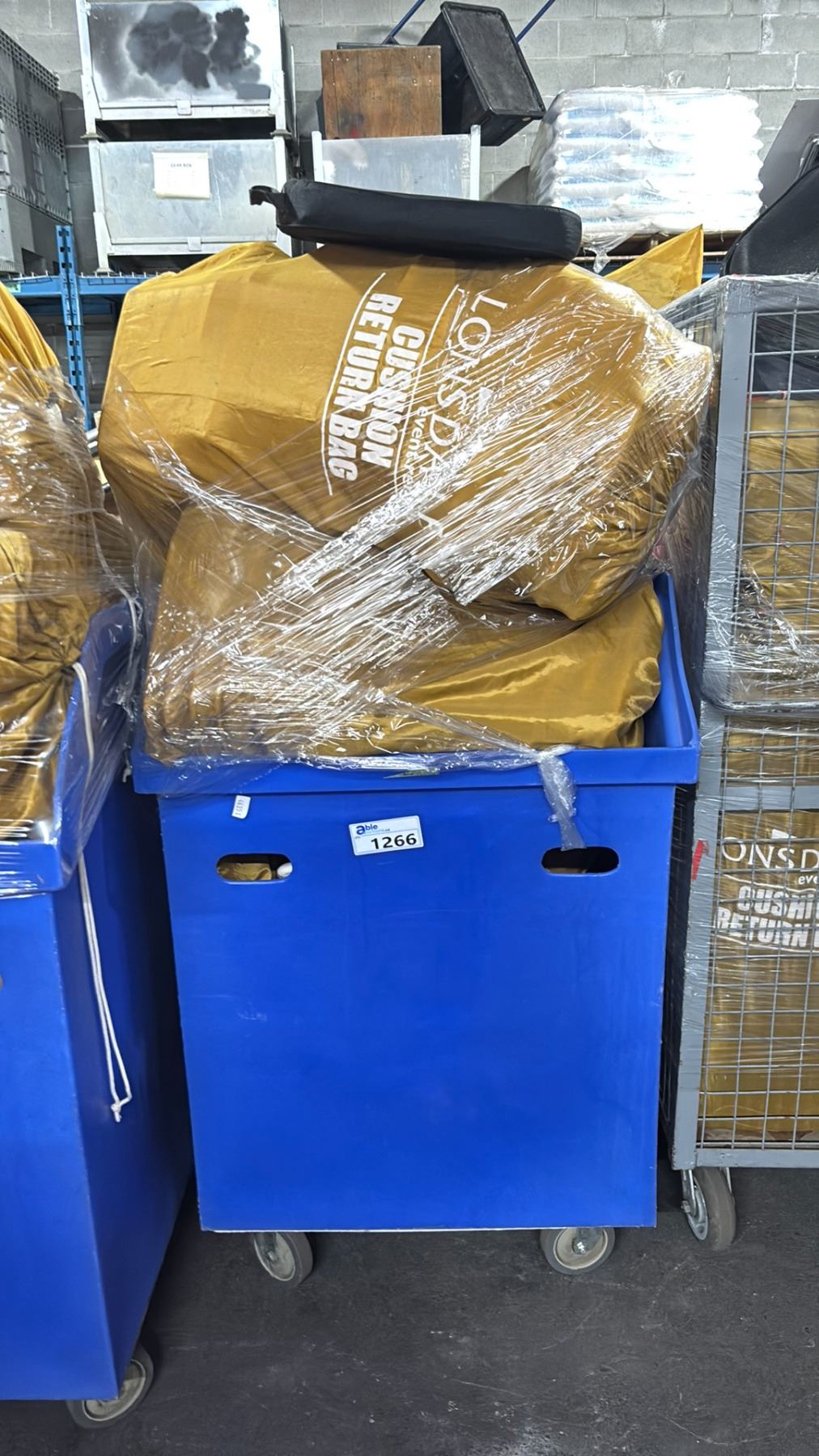 BLUE PLASTIC MOBILE EVENT CART WITH WHITE PROFESSIONAL EVENT / BANQUET CHAIR PADS *PLASTIC BIN INCLUDED* - BIN SIZE 31"W X 32"D X 47"H