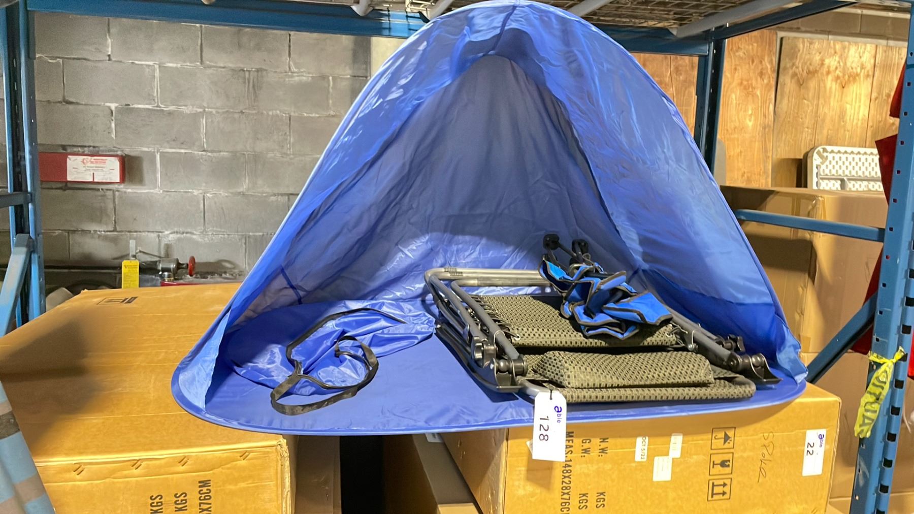 BLUE POP UP BEACH TENT WITH BAG, SMALL BLUE FOLDING CHAIR, & FOLDING PATIO LOUNGE CHAIR
