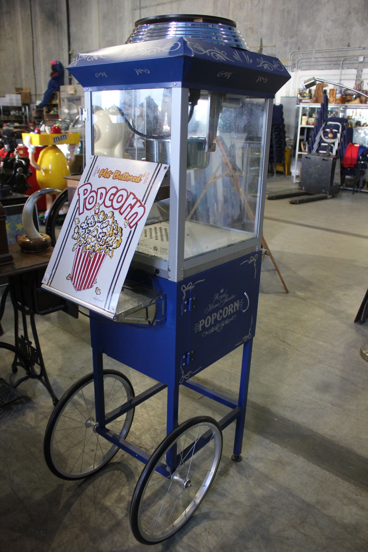 BLUE ROYAL HOME THEATER POPCORN MACHINE WITH METAL SIGN "HOT BUTTERED POPCORN"