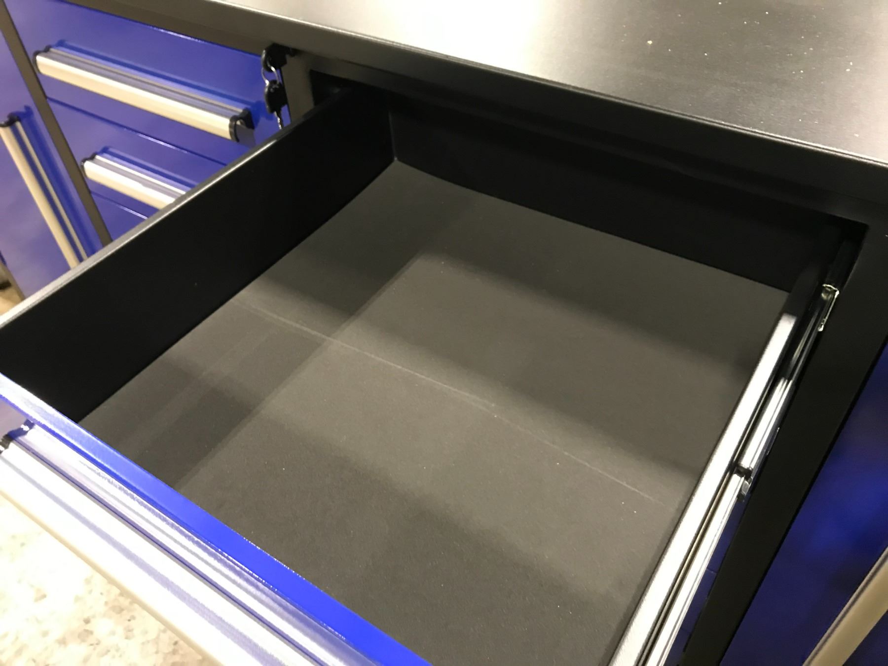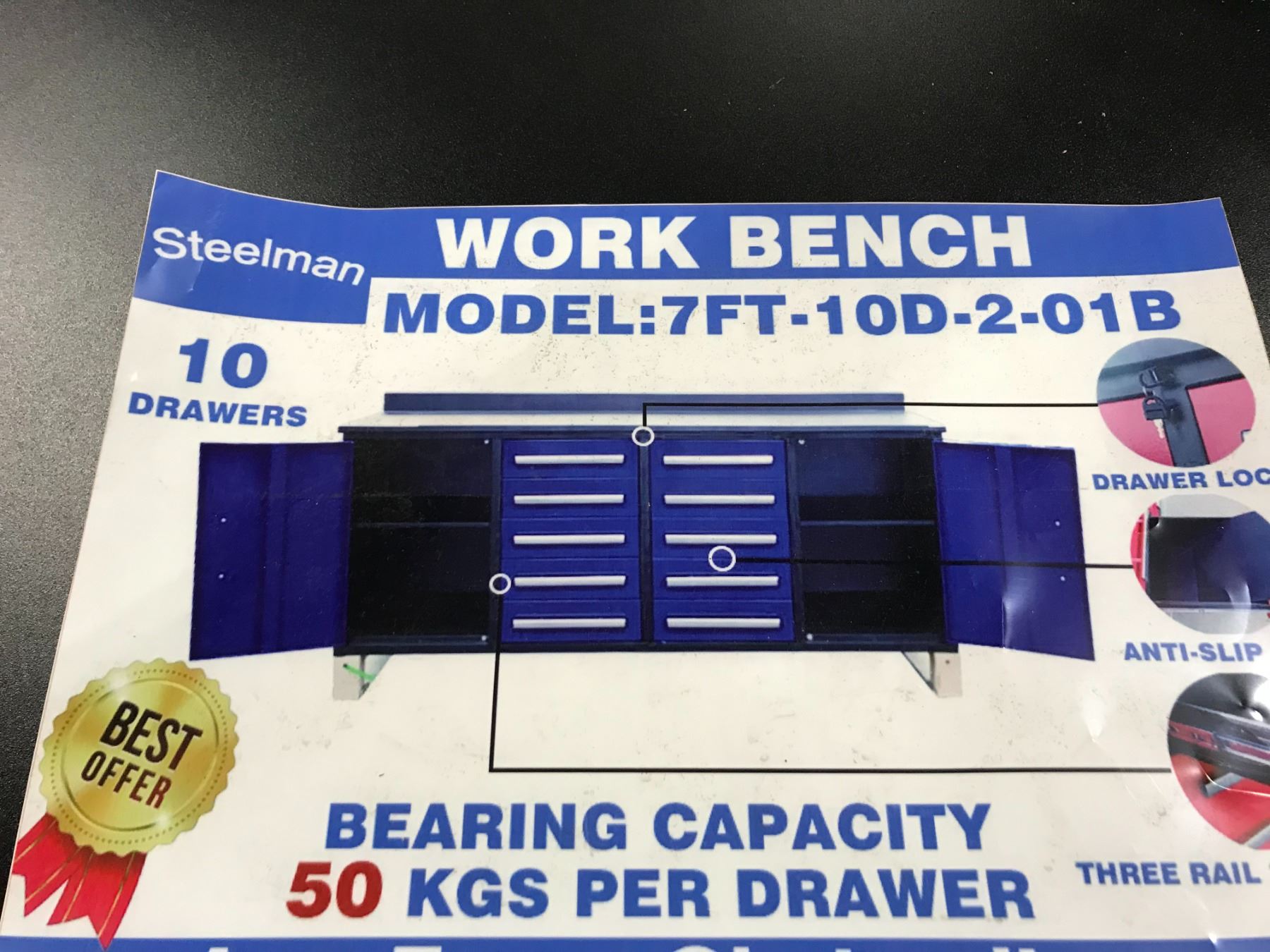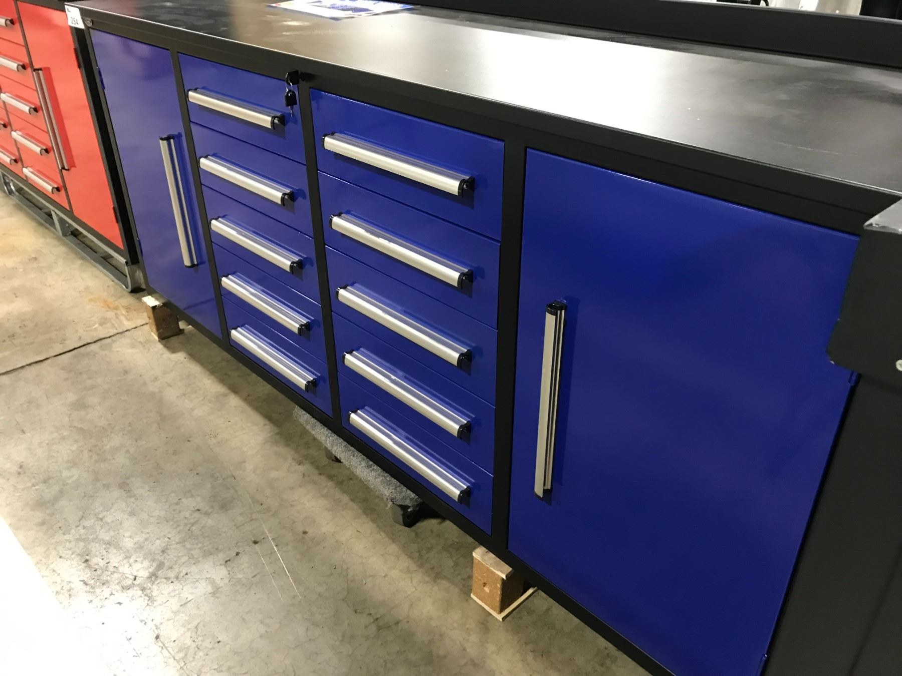 BLUE STEELMAN 10 DRAWER 2 DOOR WORK BENCH H36" X W88" X D26" WITH ANTI-SLIP LINING LOCKING DRAWERS AND KEY, AND THREE RAIL SLIDERS WITH 50KG CAPACITY PER DRAWER