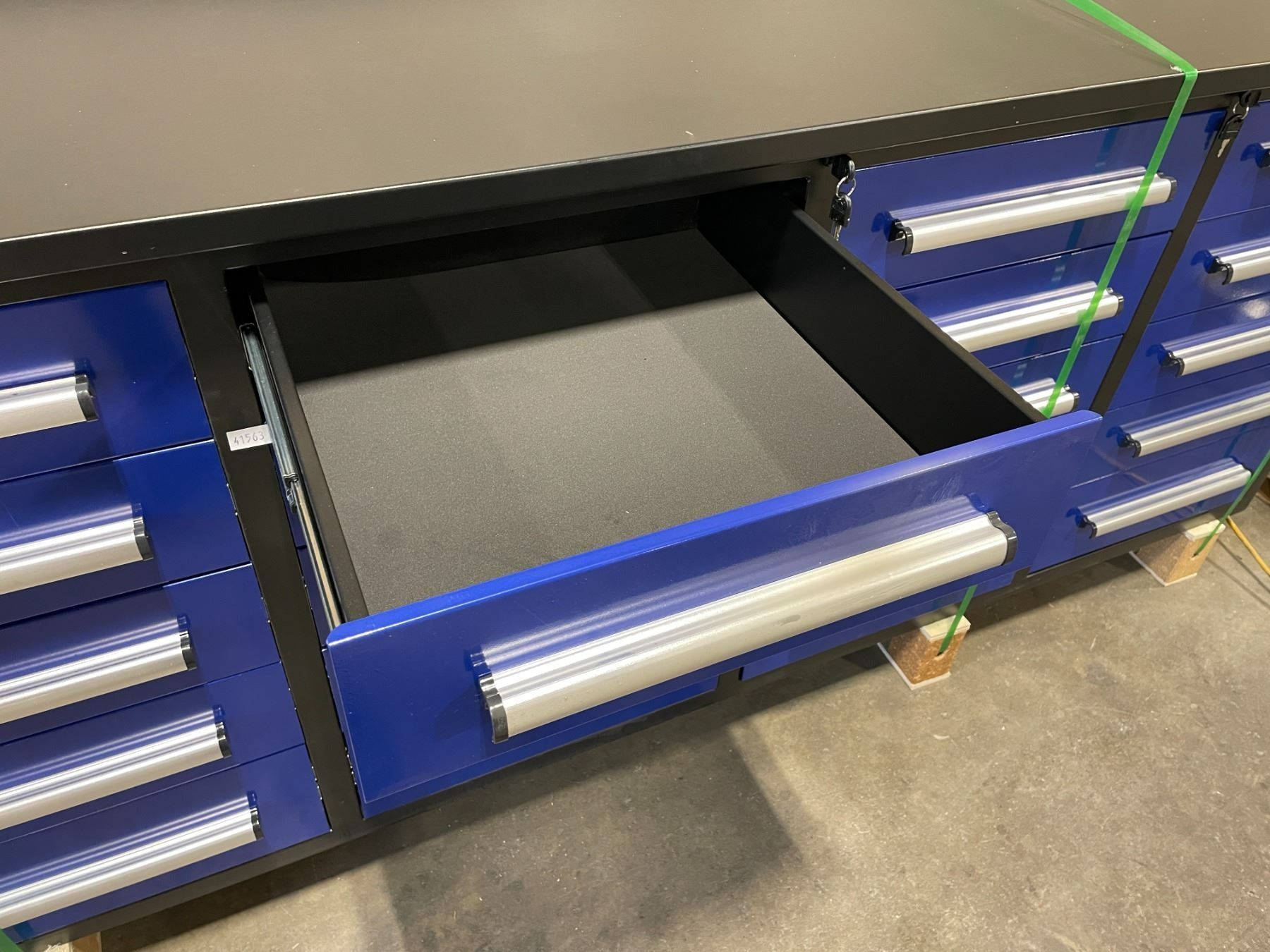 BLUE STEELMAN 25 DRAWER WORK BENCH H36" X W113" X D29" WITH ANTI-SLIP LINING LOCKING DRAWERS AND