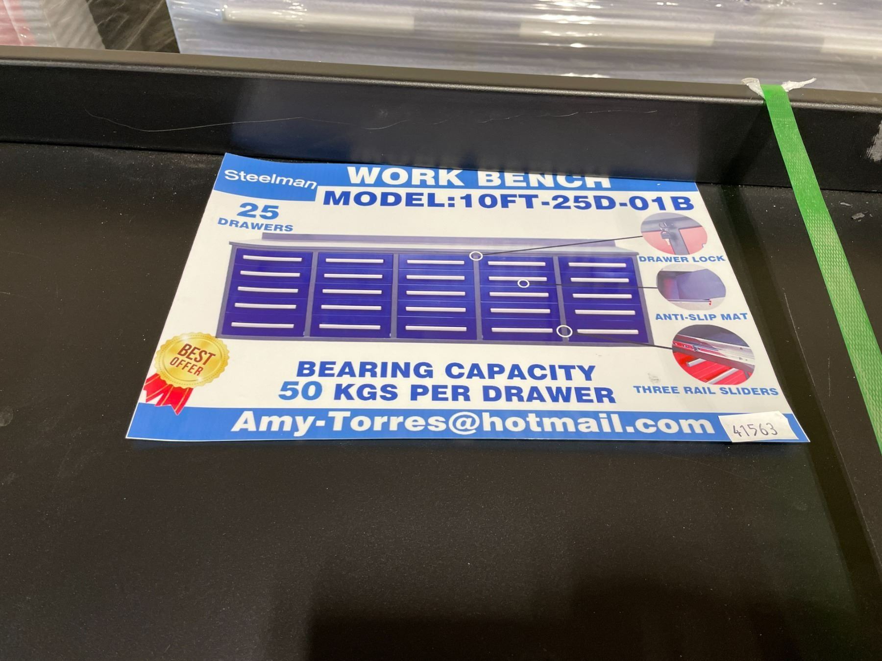 BLUE STEELMAN 25 DRAWER WORK BENCH H36" X W113" X D29" WITH ANTI-SLIP LINING LOCKING DRAWERS AND DRAWERS AND KEY, AND THREE RAIL SLIDERS WITH 50KG CAPACITY PER DRAWER