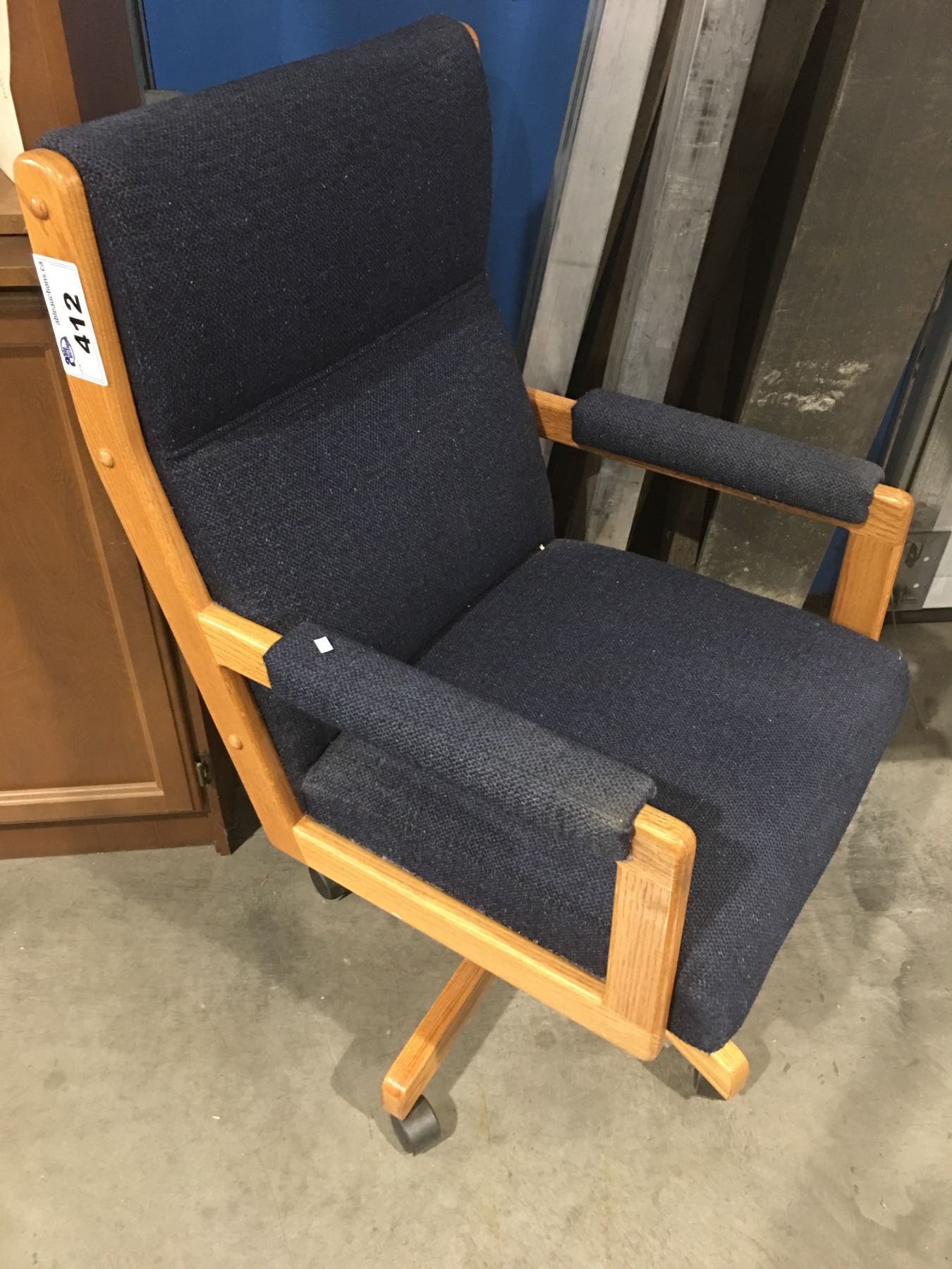 BLUE UPHOLSTERED WITH OAK OFFICE CHAIR
