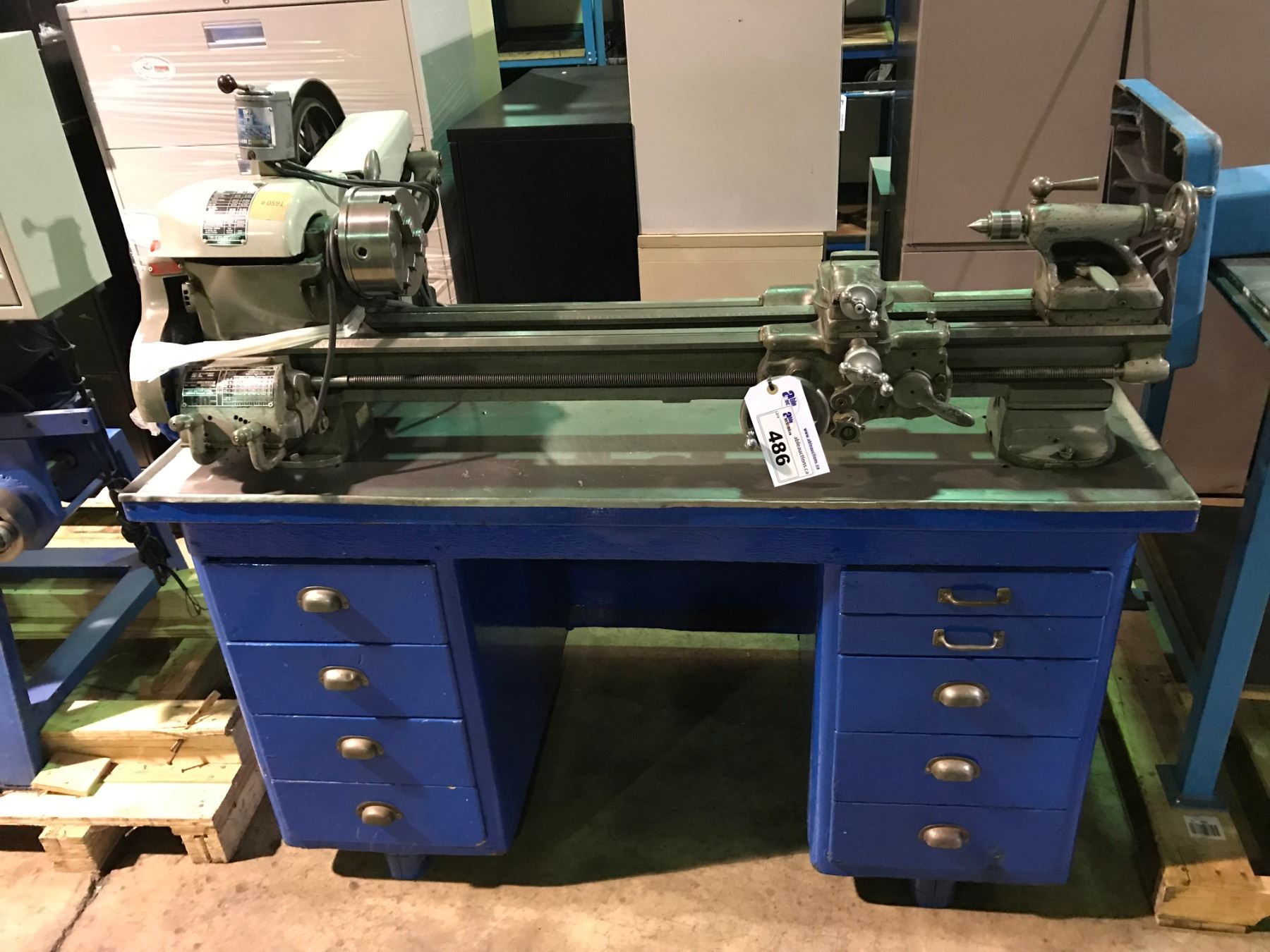BLUE WOOD & METAL TABLE WITH SOUTH BEND LATHE