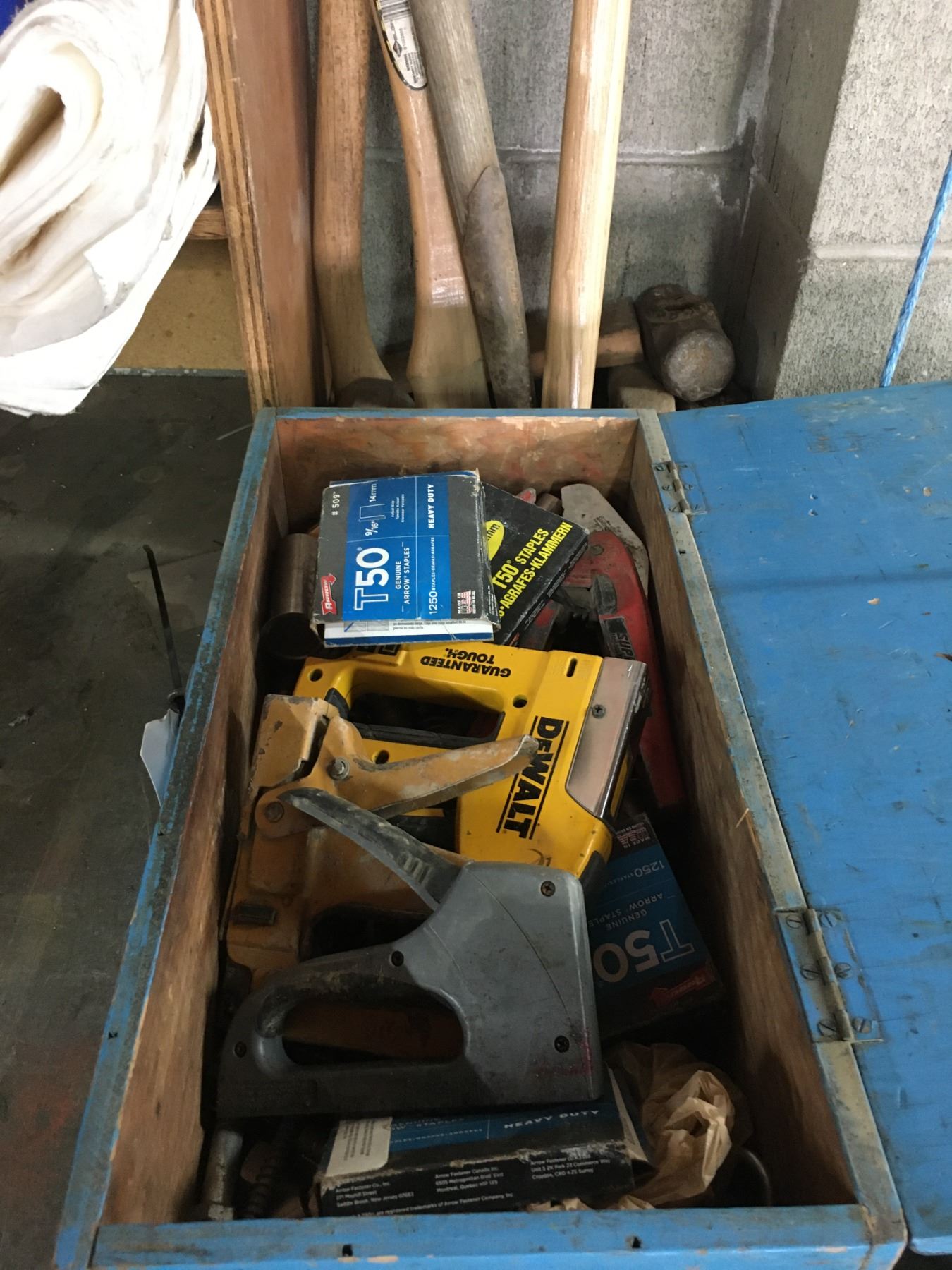 BLUE WOODEN BOX WITH STAPLERS,HARDWARE AND ASSORTED AXE & SLEDGE HAMMERS