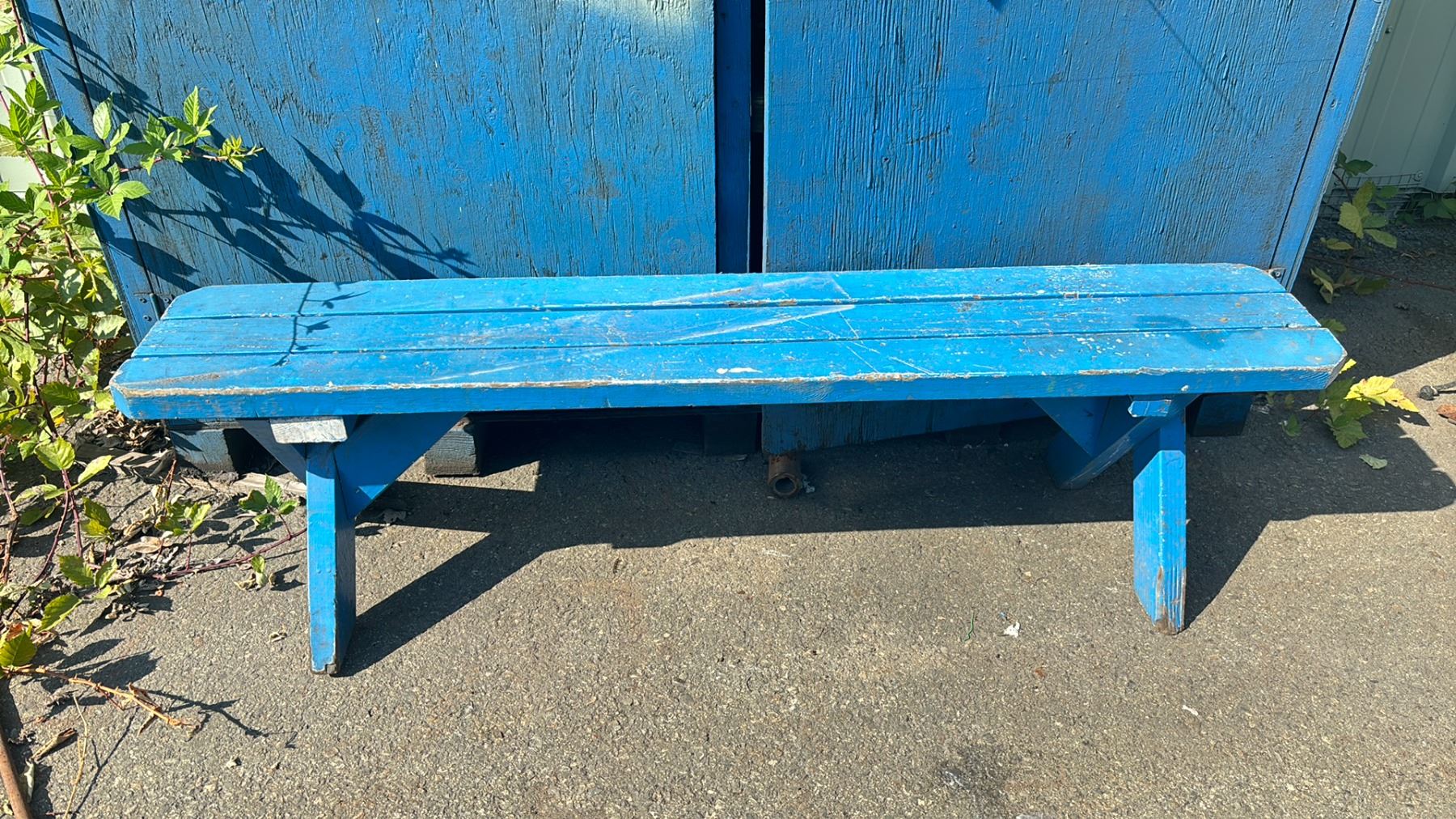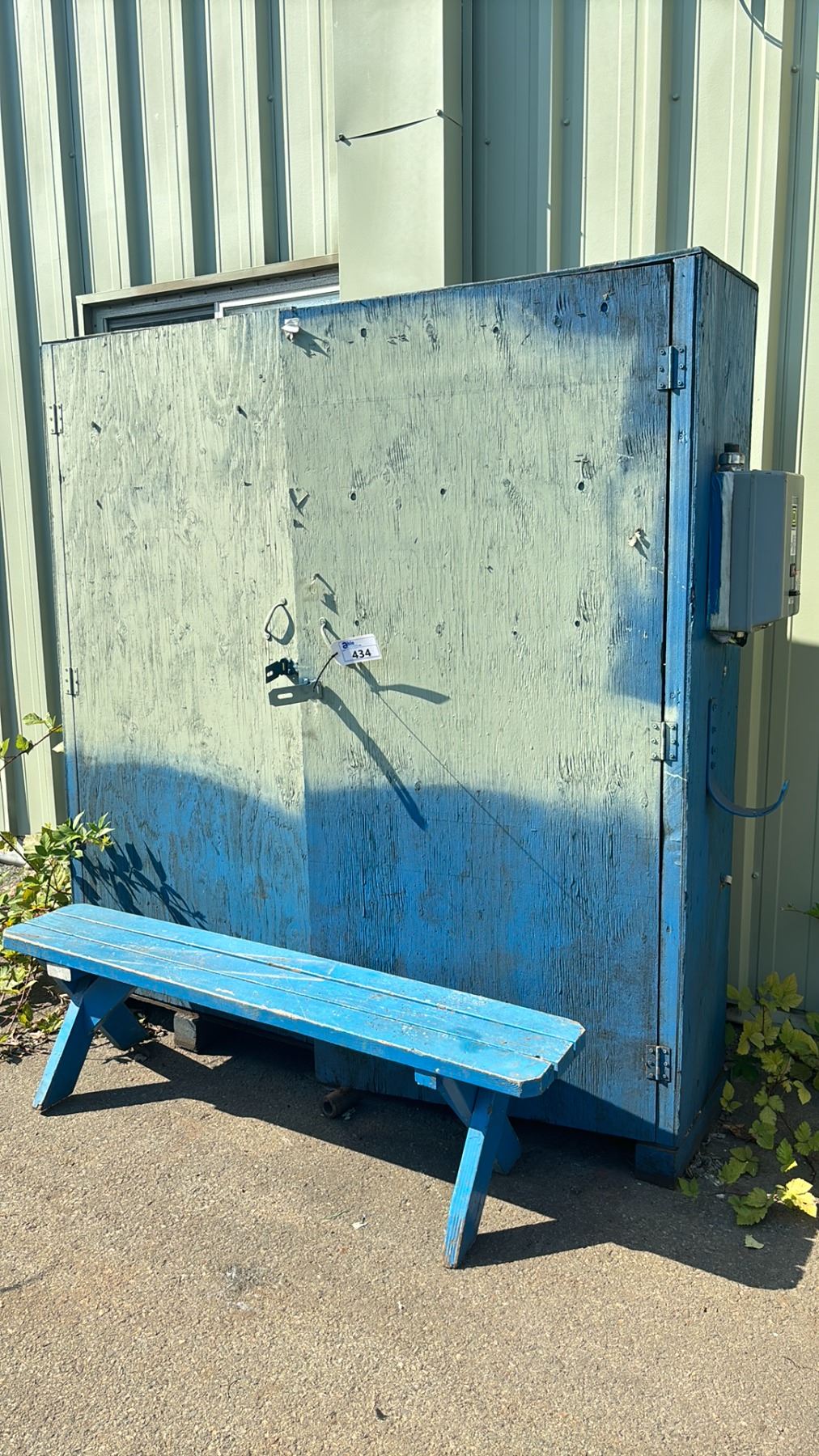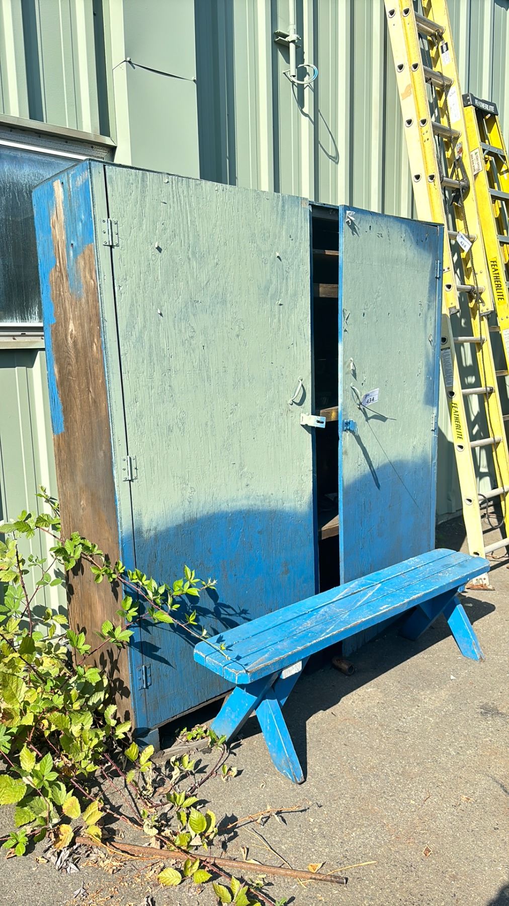 BLUE WOODEN STORAGE CABINET - APPROX. 6'W X 1.5'W X 6.5'H & A 5' BLUE WOODEN BENCH SEAT