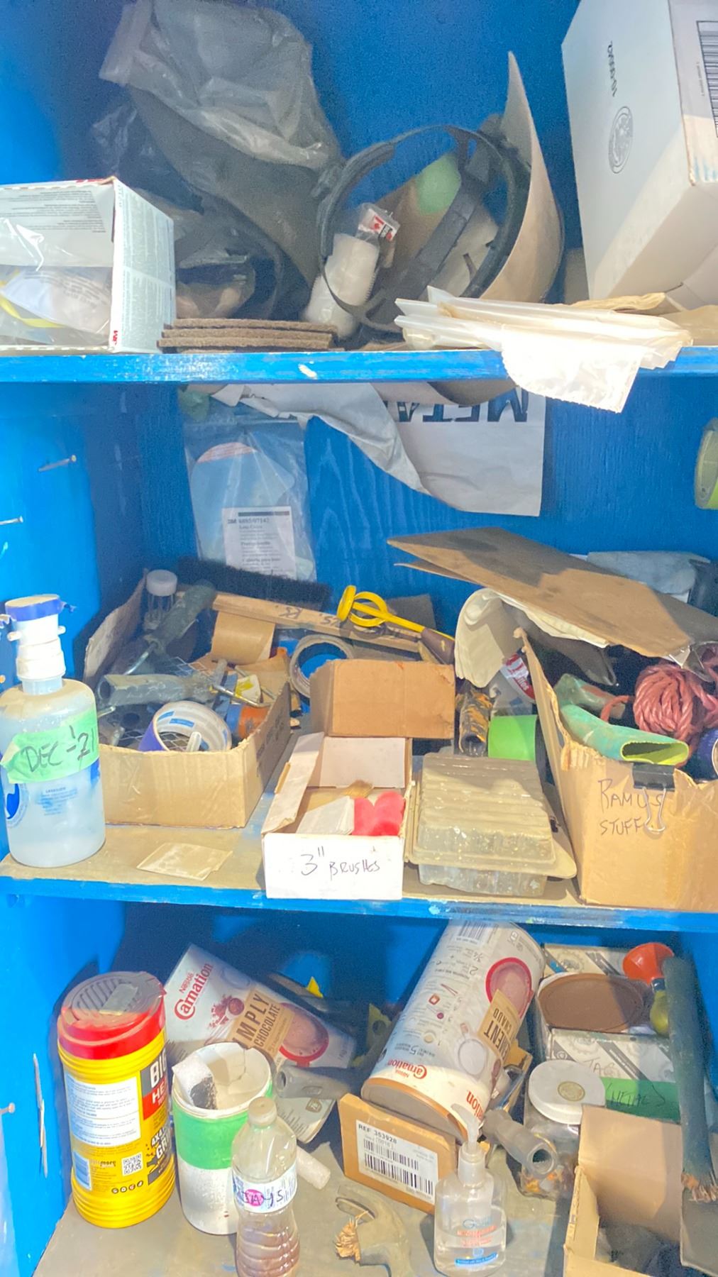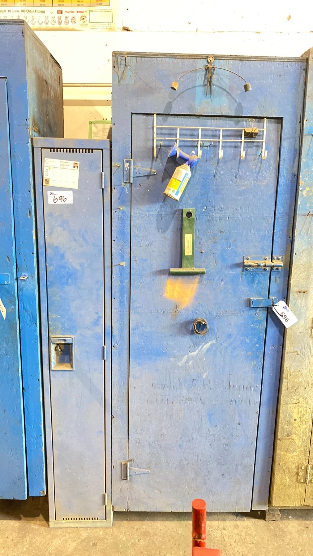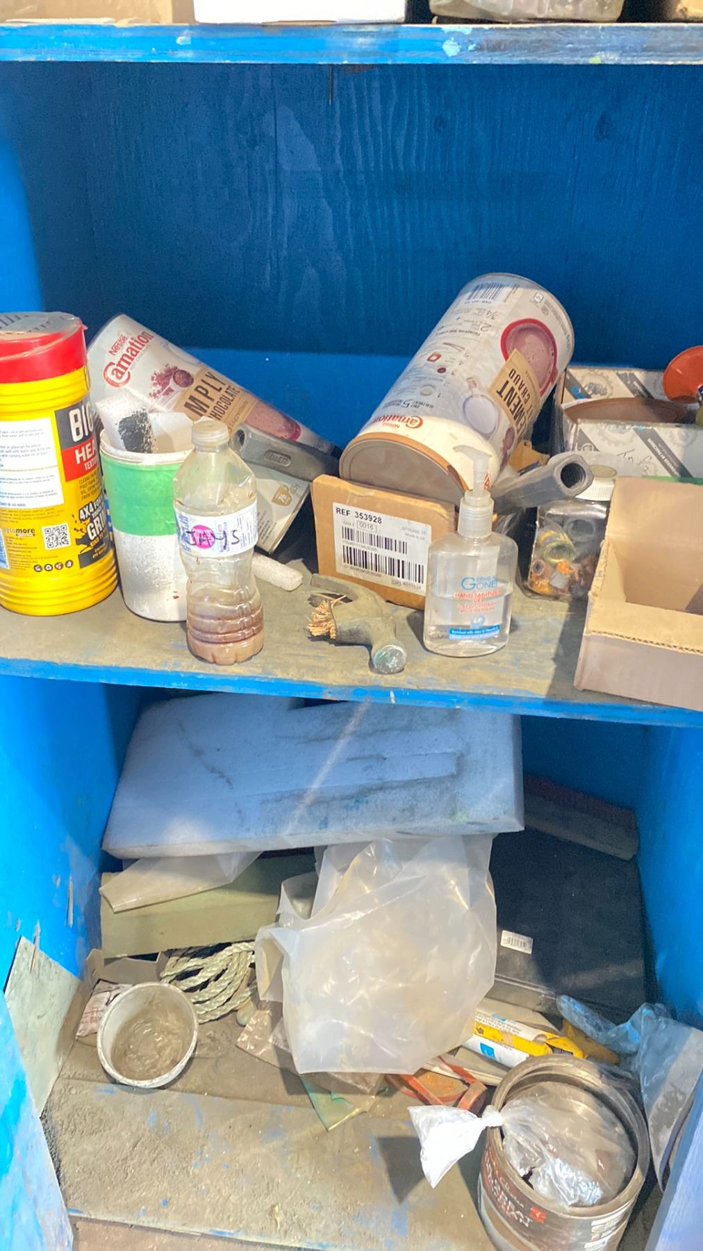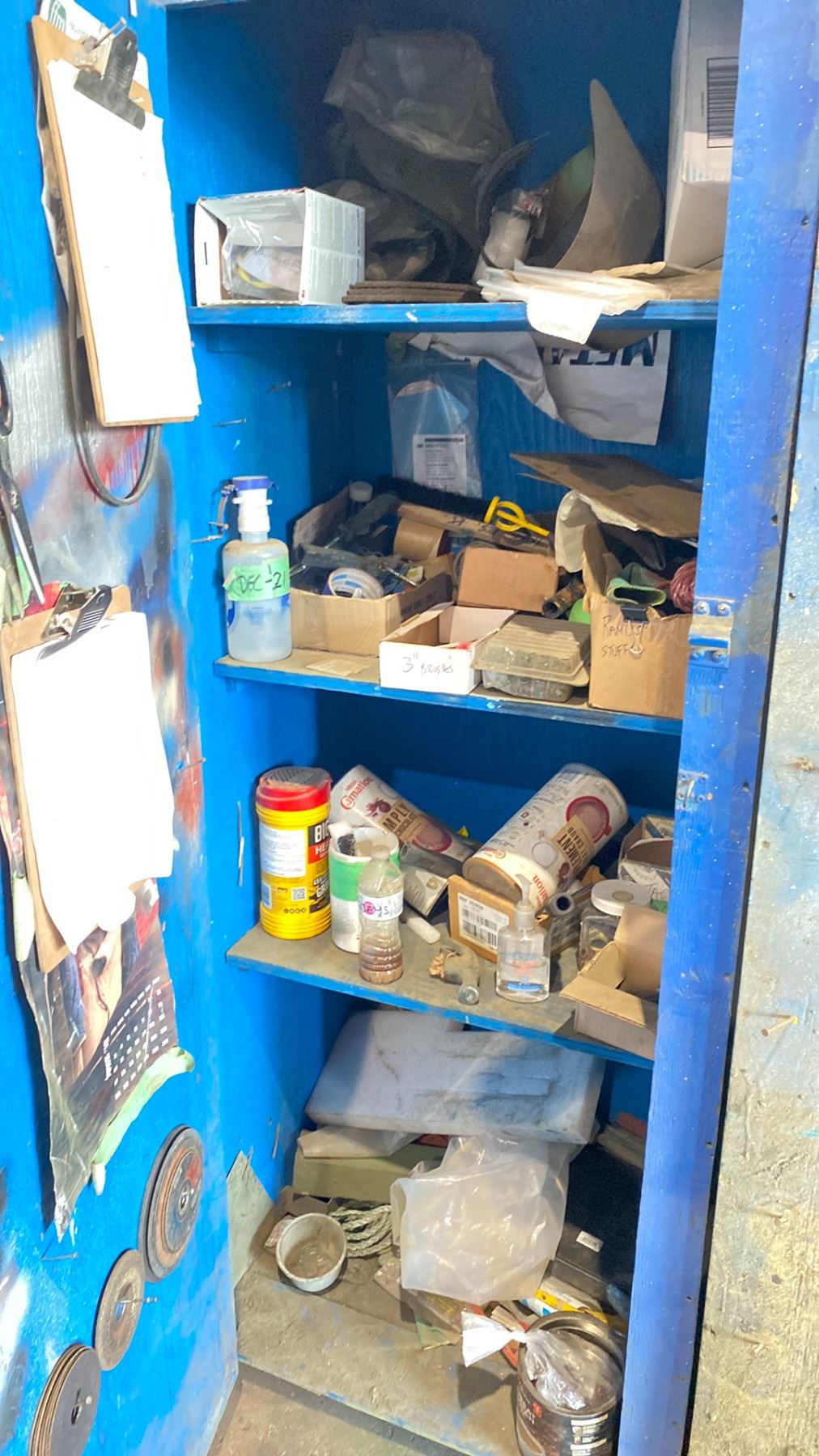 BLUE WOODEN STORAGE CABINET & CONTENTS - ASSORTED SHOP MISCELLANEOUS - APPROX. 2.5'W X 2'D X 7'H & A BLUE METAL STORAGE LOCKER