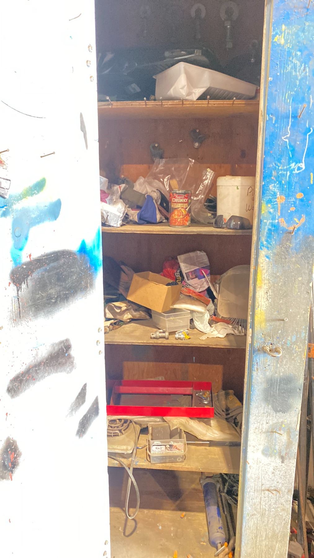 BLUE WOODEN STORAGE CABINET & CONTENTS - ASSORTED SHOP MISCELLANEOUS - APPROX. 2.5'W X 2'D X 7'H & SONY RADIO