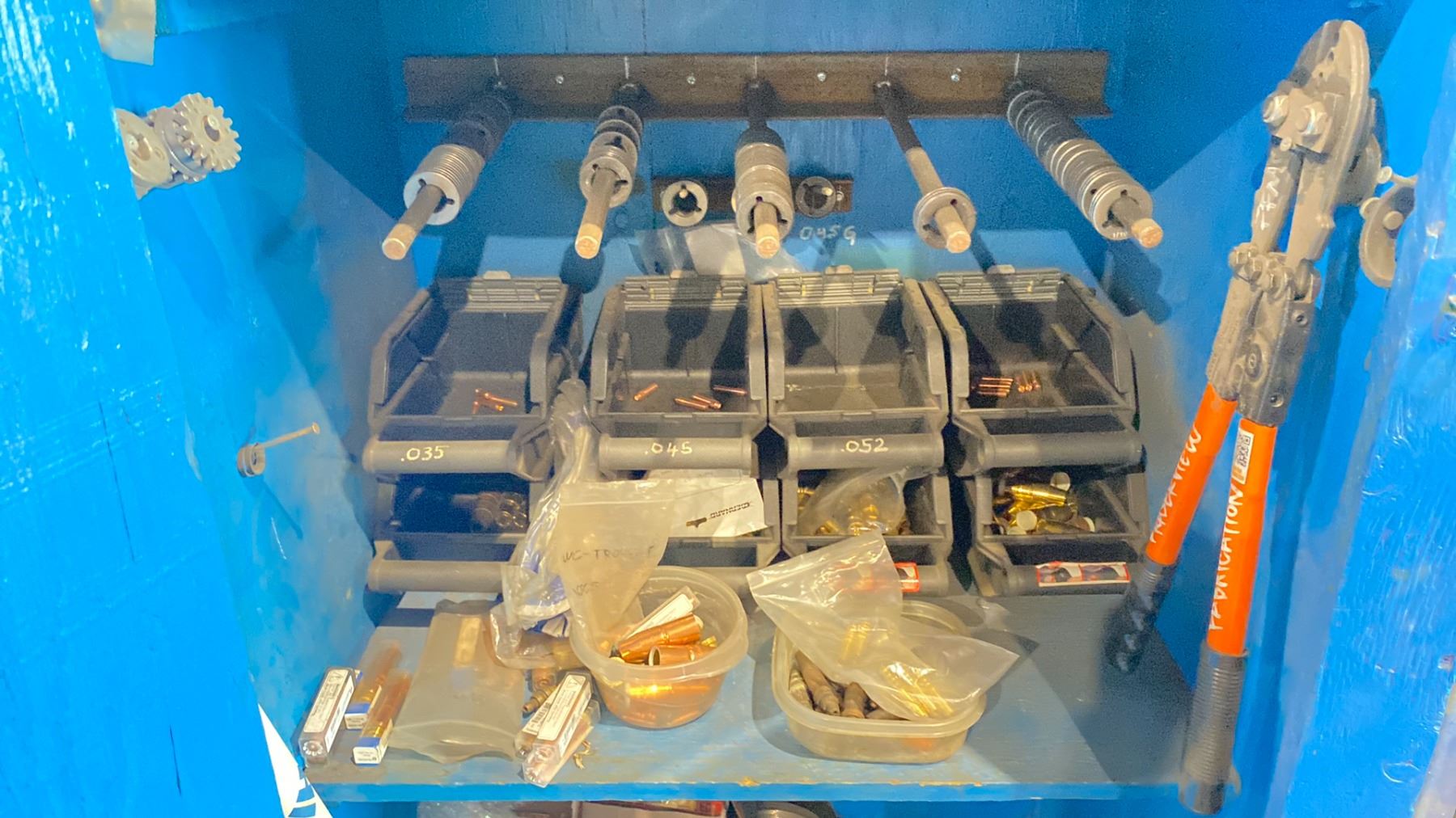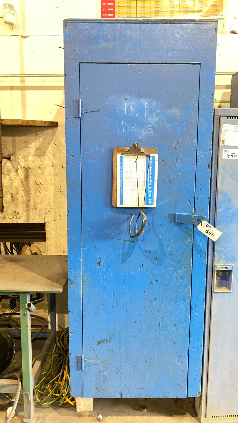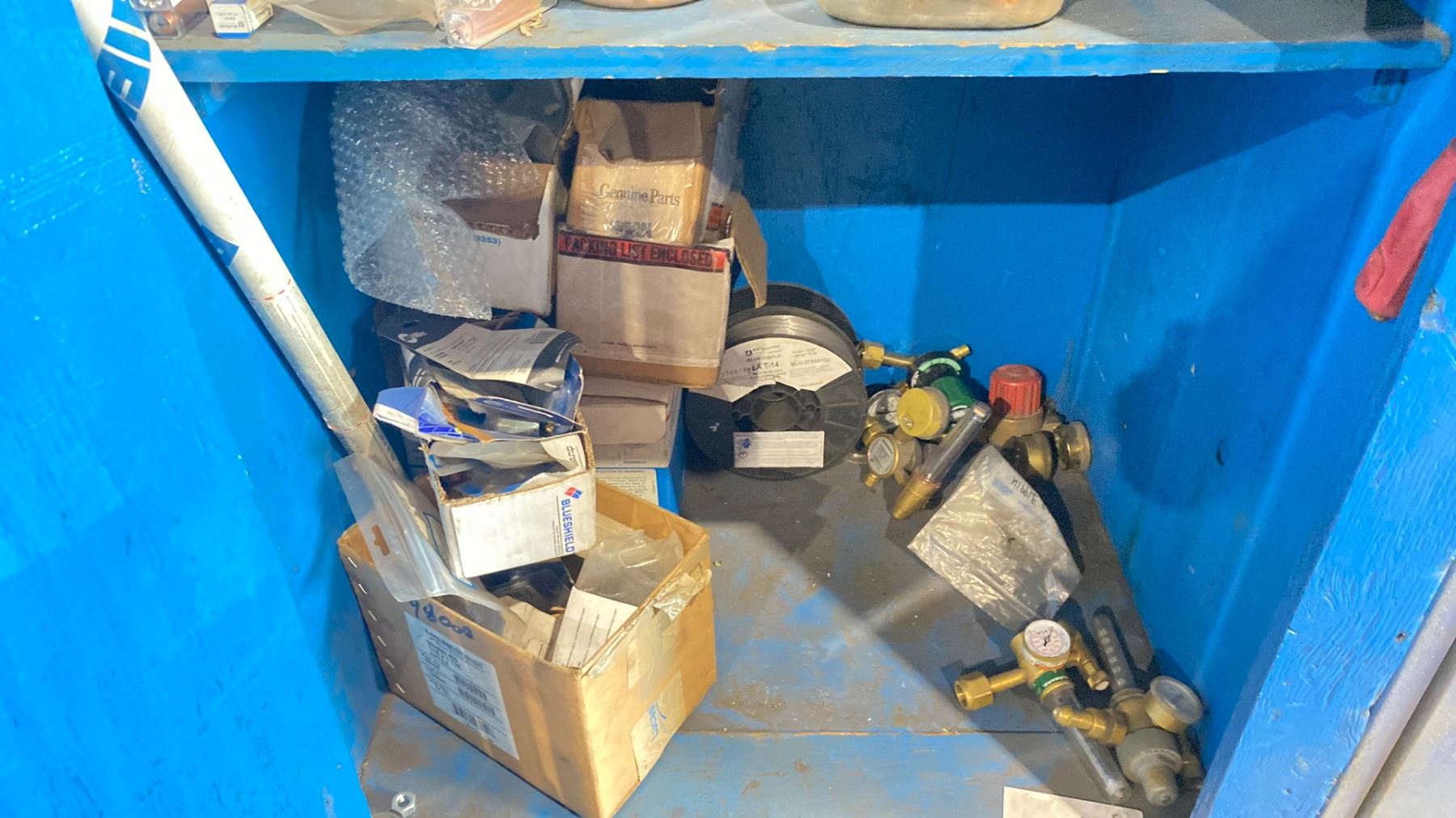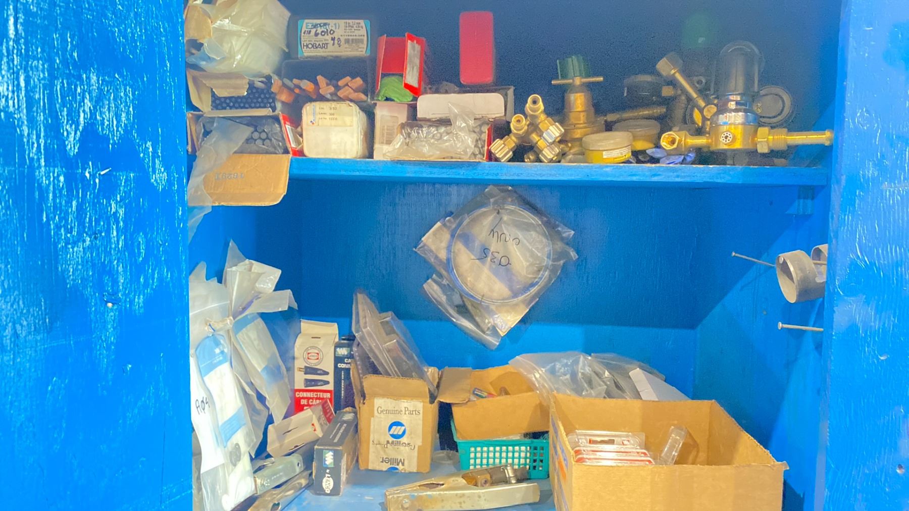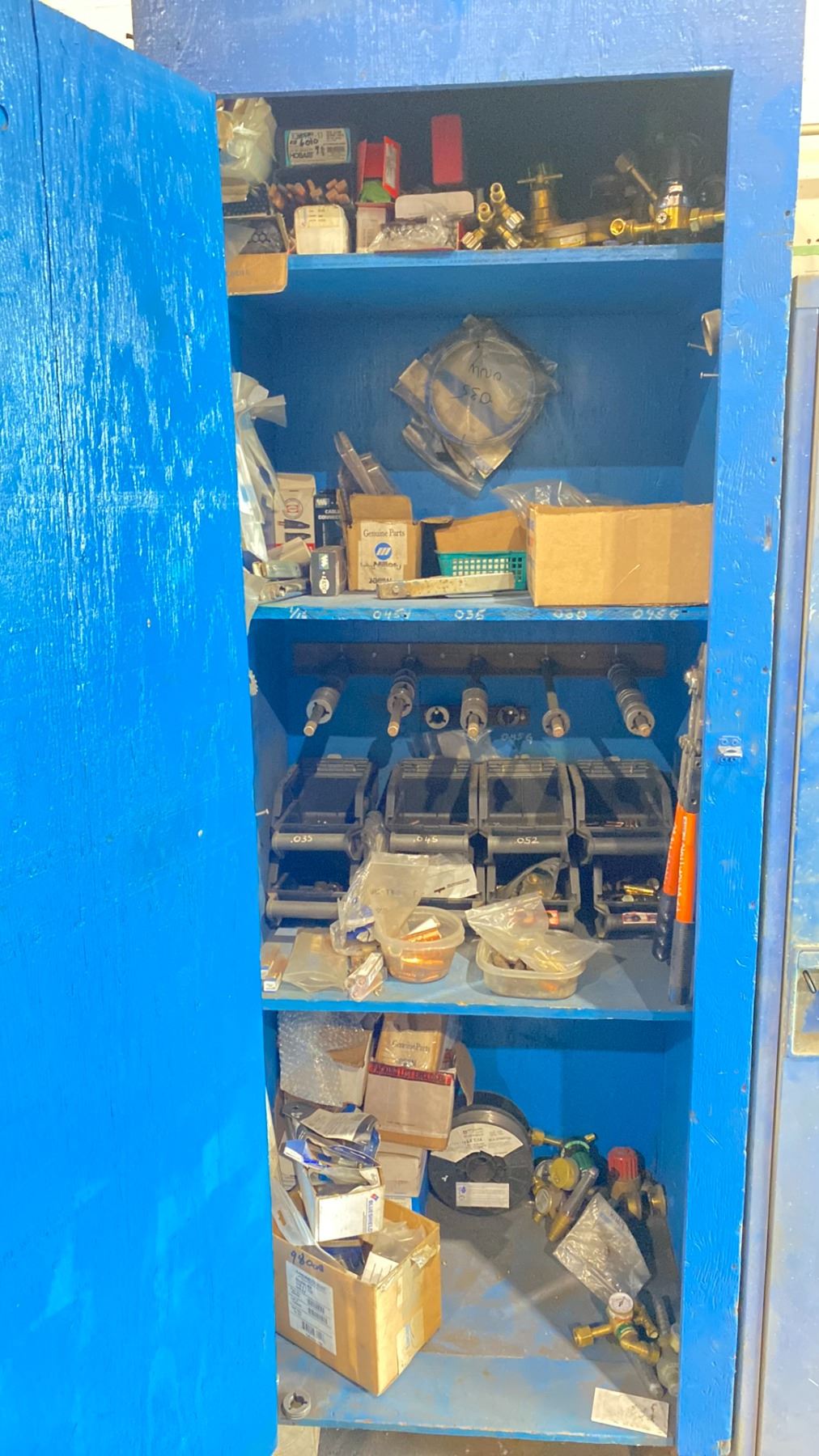 BLUE WOODEN STORAGE CABINET & CONTENTS - ASSORTED WELDING SUPPLIES + ACCESSORIES - APPROX. 2.5'W X 2'D X 7'H