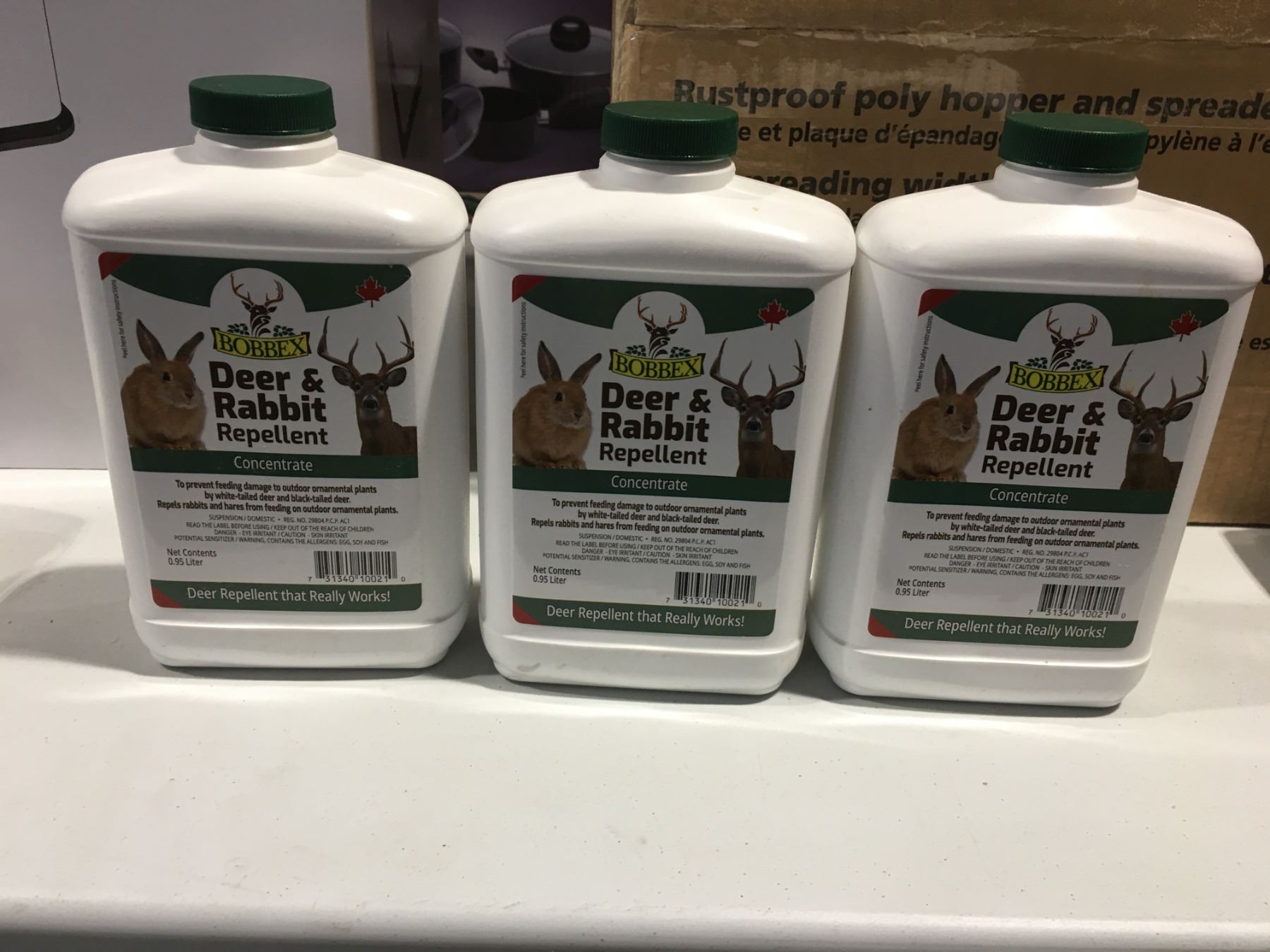 BOBBEX DEER & RABBIT REPELLENT CONCENTRATE 3 X .95 L BOTTLES THIS REPELLENT USES ALL NATURAL, ENVIRONMENTALLY FRIENDLY INGREDIENTS TO PRODUCE A WIDE RANGE OF SCENT AND TASTE DETERRENTS. SAFE FOR USE ON ALL ORNAMENTAL PLANTS, TREES AND SHRUBS. MSRP $35.99 EACH.