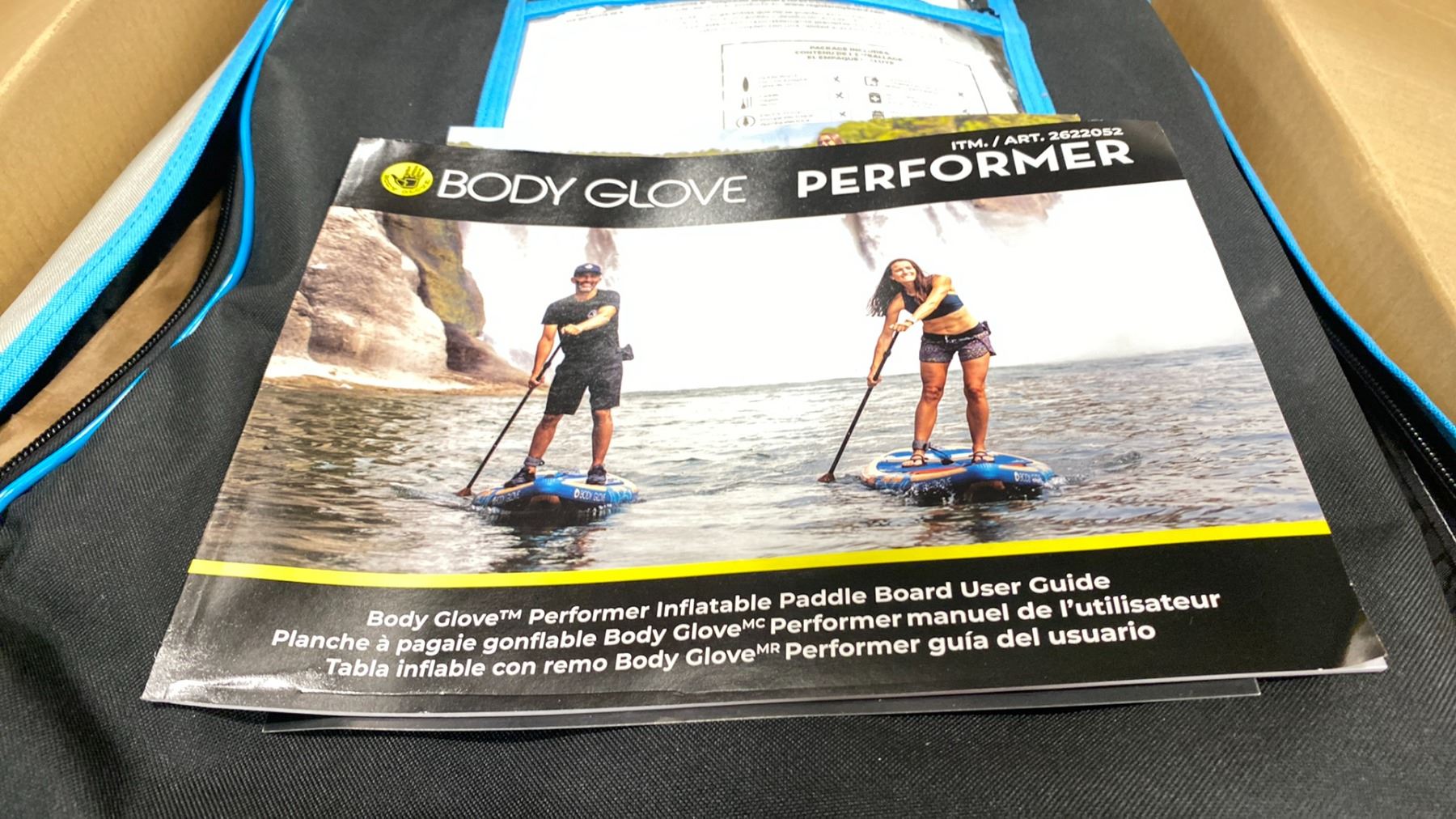 BODY GLOVE PERFORMER SERIES INFLATABLE PADDLE BOARD W/BAG AND ACCESSORIES