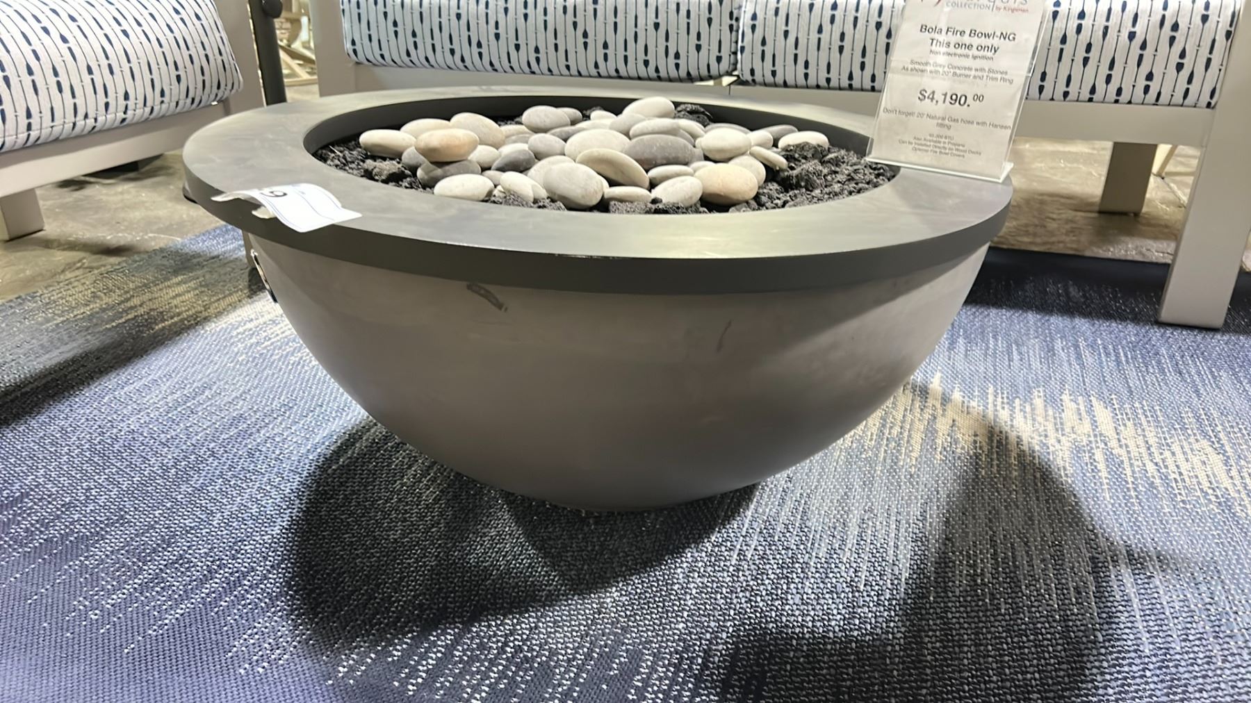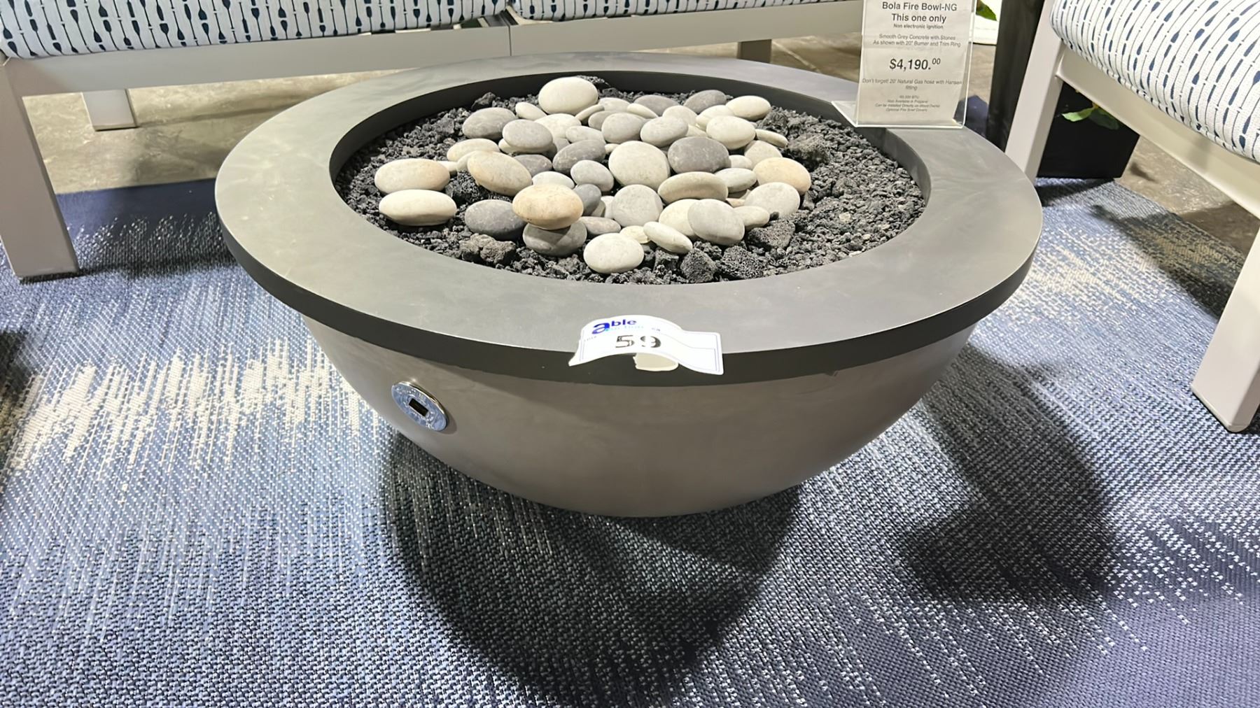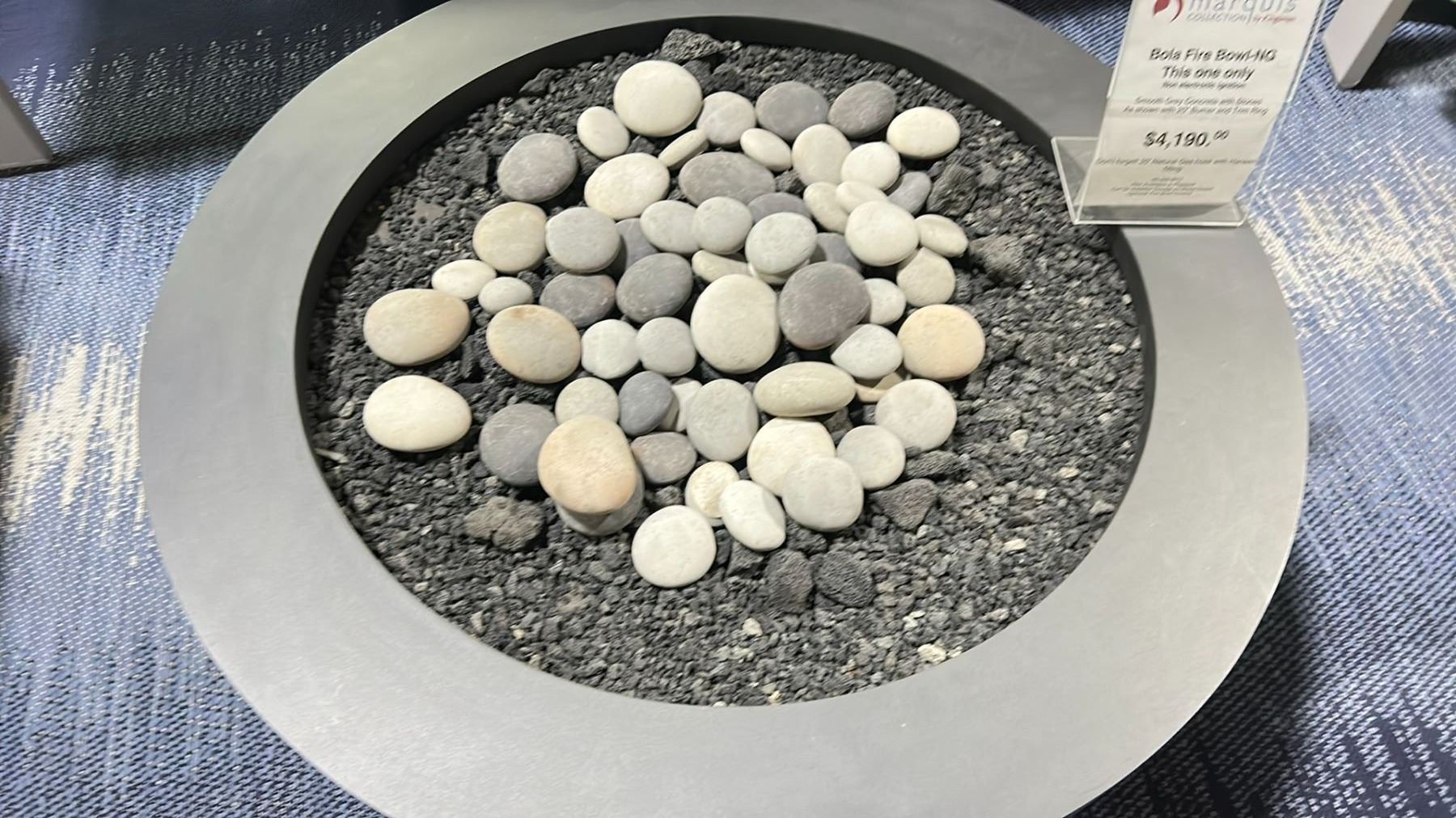 BOLA FIRE BOWL NATURAL GAS TABLE . NON ELECTRONIC IGNITION. SMOOTH GREY CONCRETE WITH STONES. 20" BURNER. 32" DIAMETER 15" HIGH. COMES WITH COVER RETAIL $4190