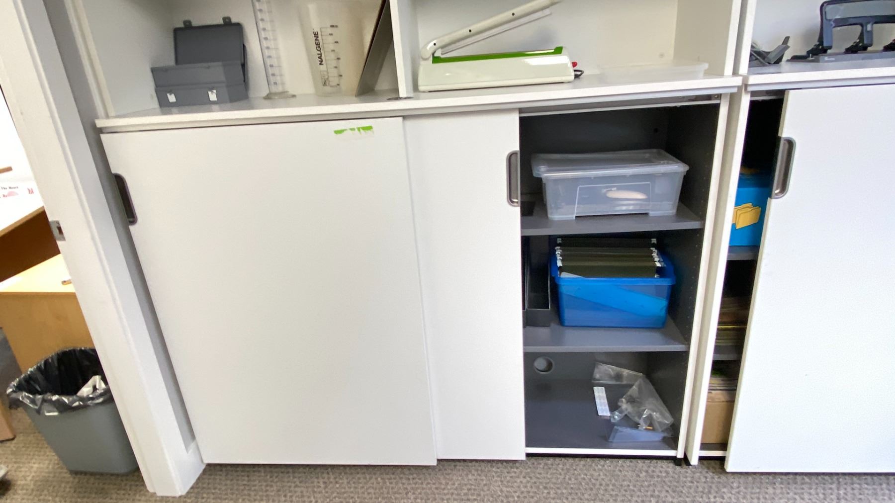 BOOKSHELF STYLE FILING CABINET WITH SLIDING DOORS 79" HIGH, 63 X 15.5" (CONTENTS NOT INCLUDED) COMBINATION LOCKS (COMBINATION UNKNOWN)