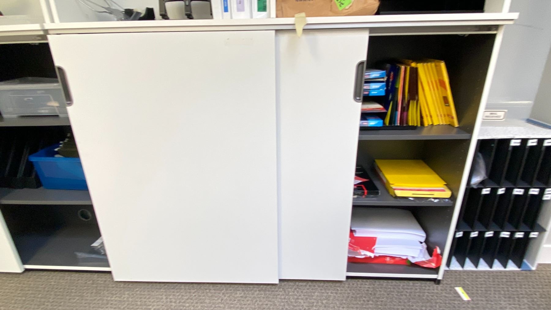 BOOKSHELF STYLE FILING CABINET WITH SLIDING DOORS 79" HIGH, 63 X 15.5" (CONTENTS NOT INCLUDED) COMBINATION LOCKS (COMBINATION UNKNOWN)