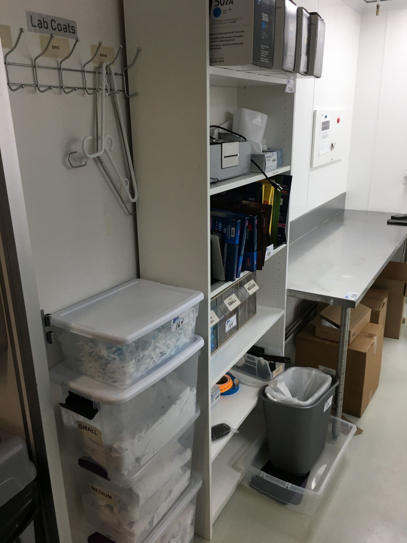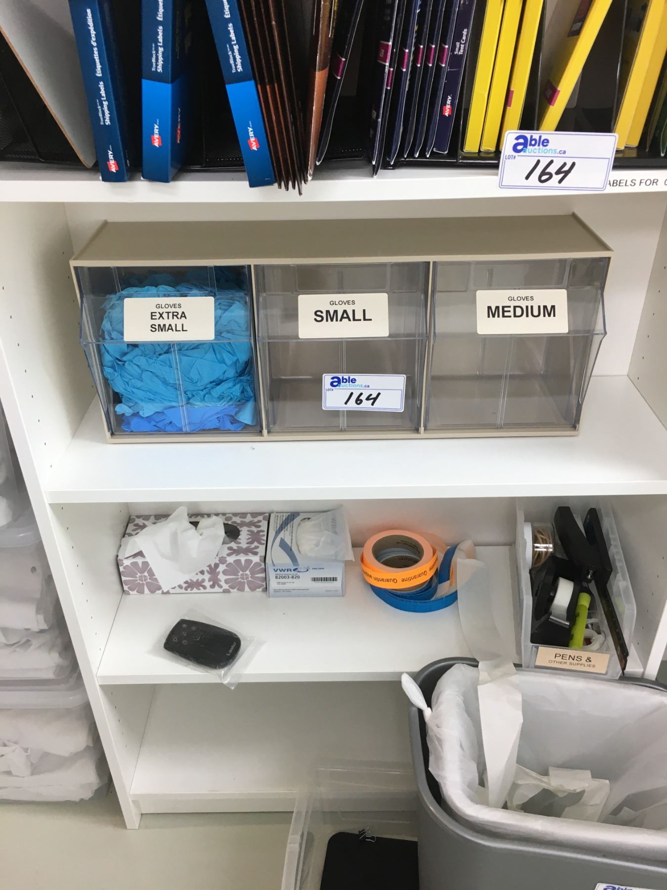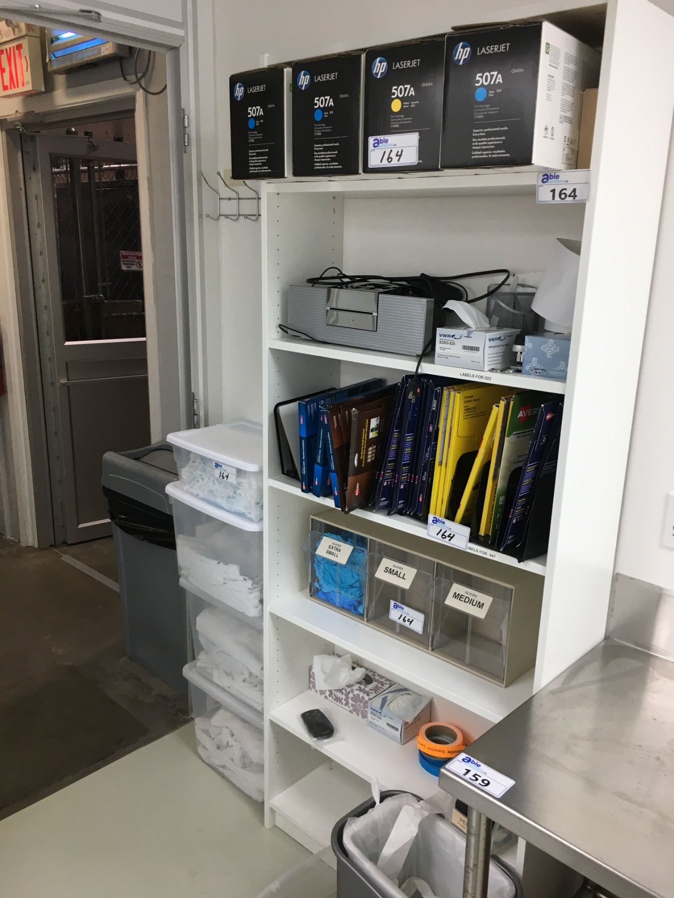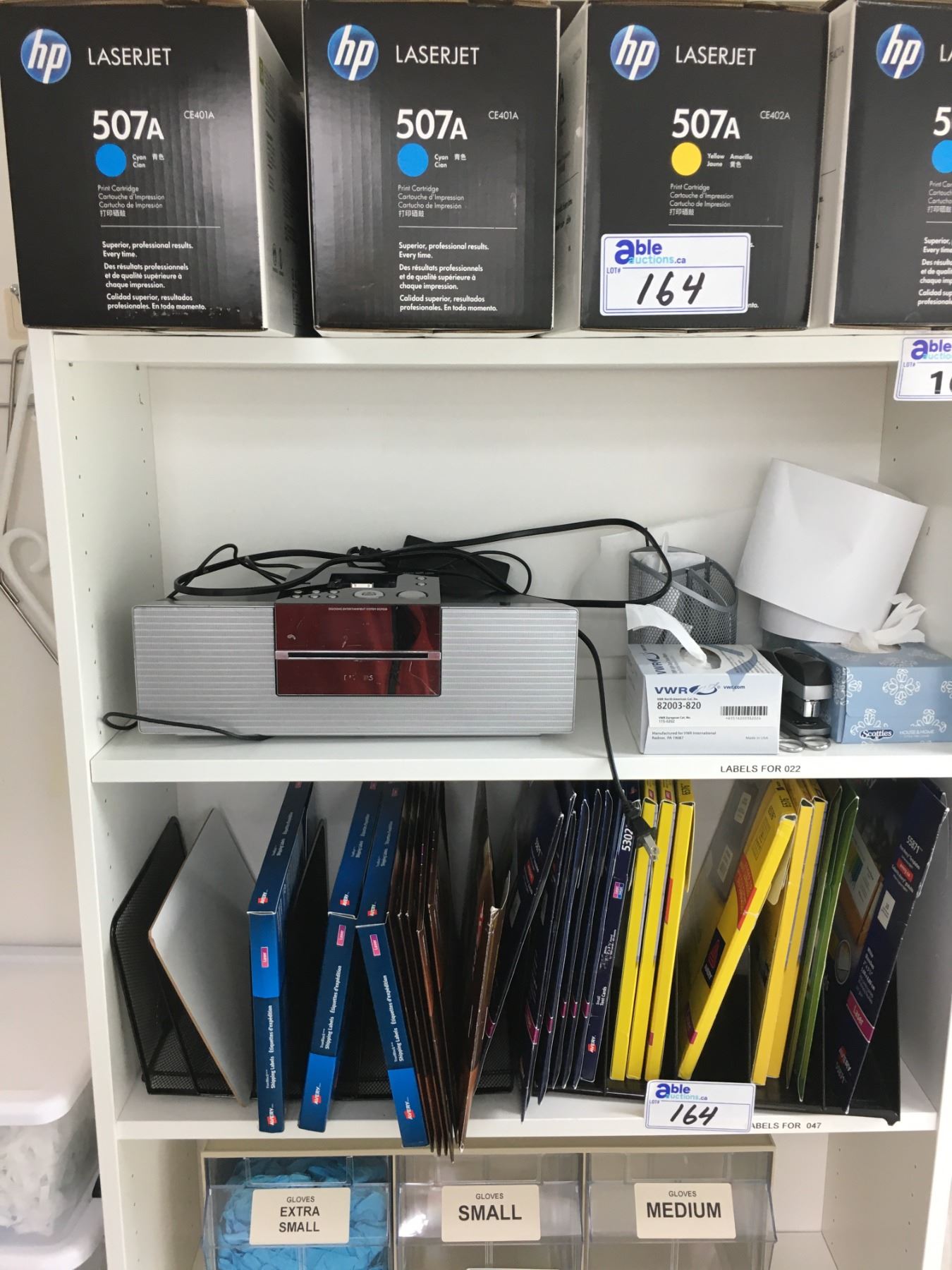 BOOKSHELF WITH CONTENTS; SHIPPING LABLES, HP TONER, OFFICE SUPPLIES AND MORE