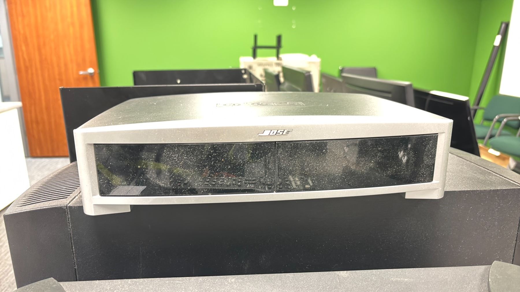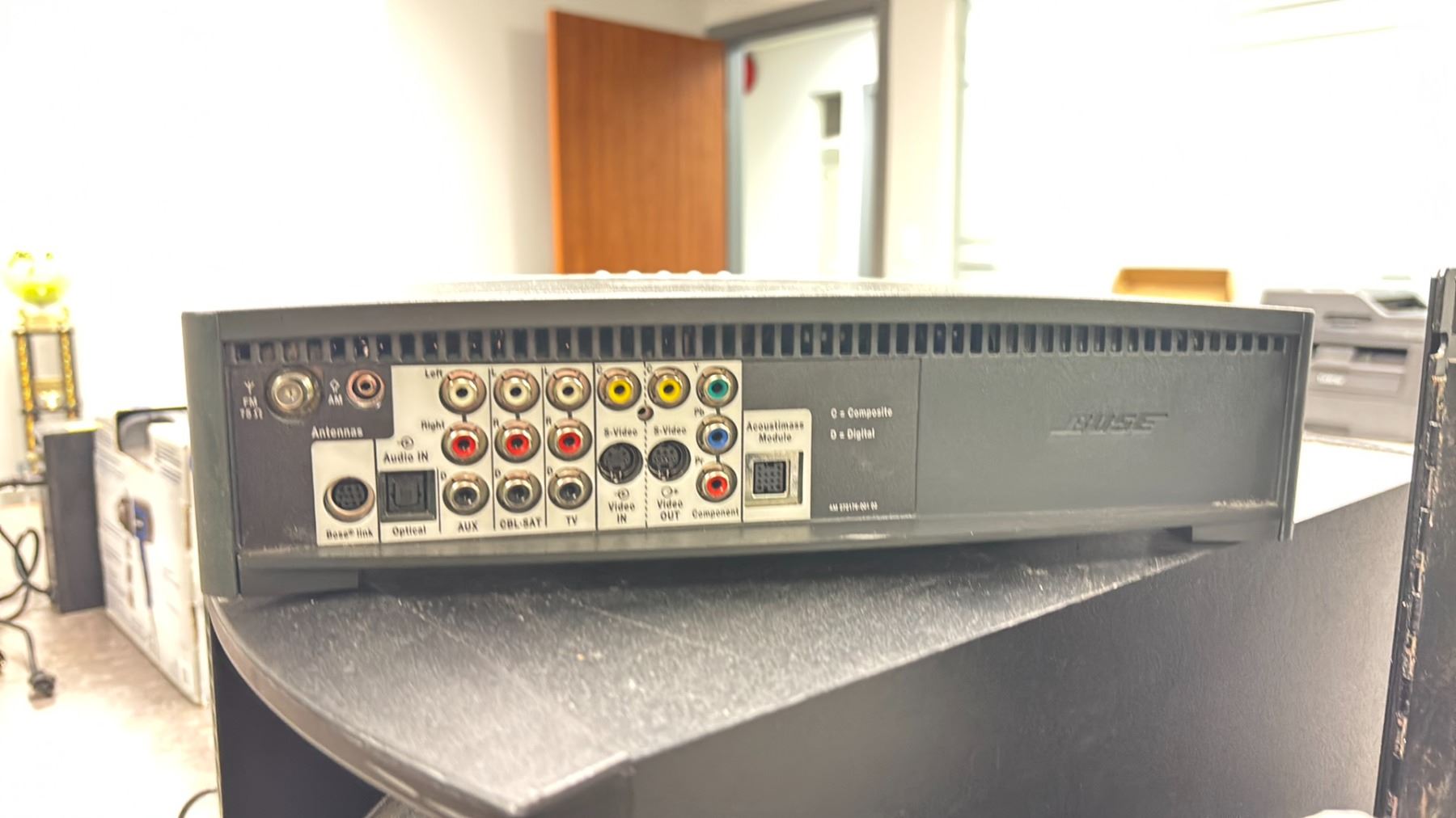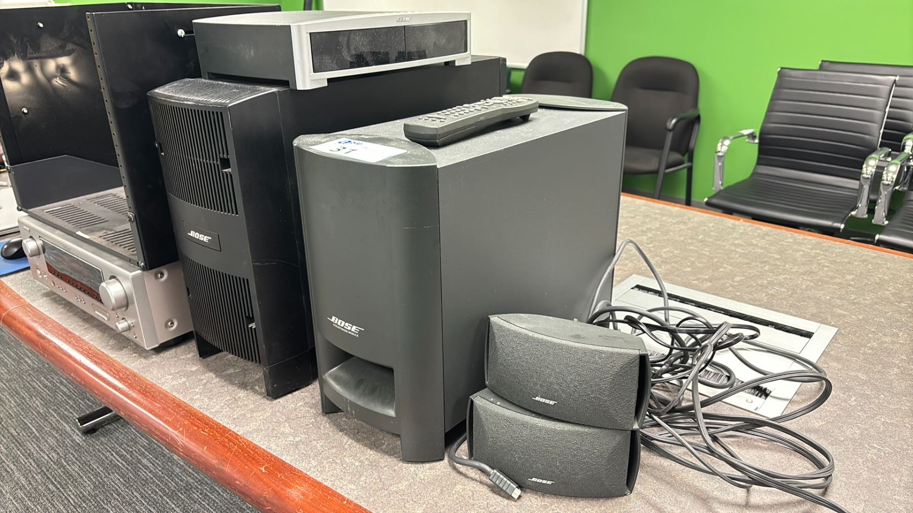 BOSE PS3-2-1 II POWERED SPEAKER SYSTEM, BOSE BASS, PAIR OF SMALL BOSE SPEAKERS WITH CORDS, BOSE CONTROL MODULE FOR SPEAKER SYSTEM, BOSE REMOTE, BAG OF ASSORTED SIZE BOSE SPEAKERS, DENON MULTI ZONE HOME ENTERTAINMENT COMPONENT & A BLACK WALL MOUNT