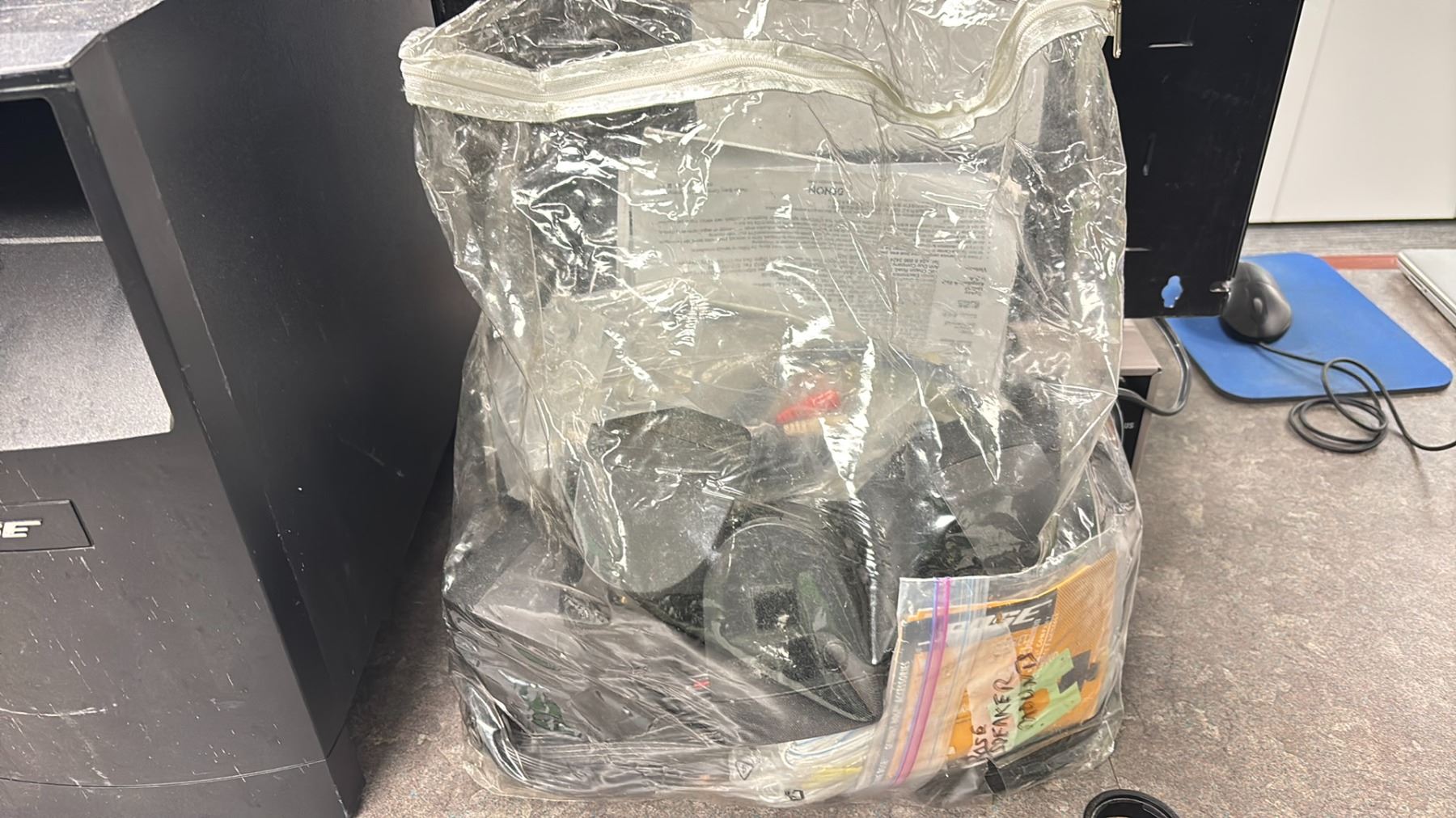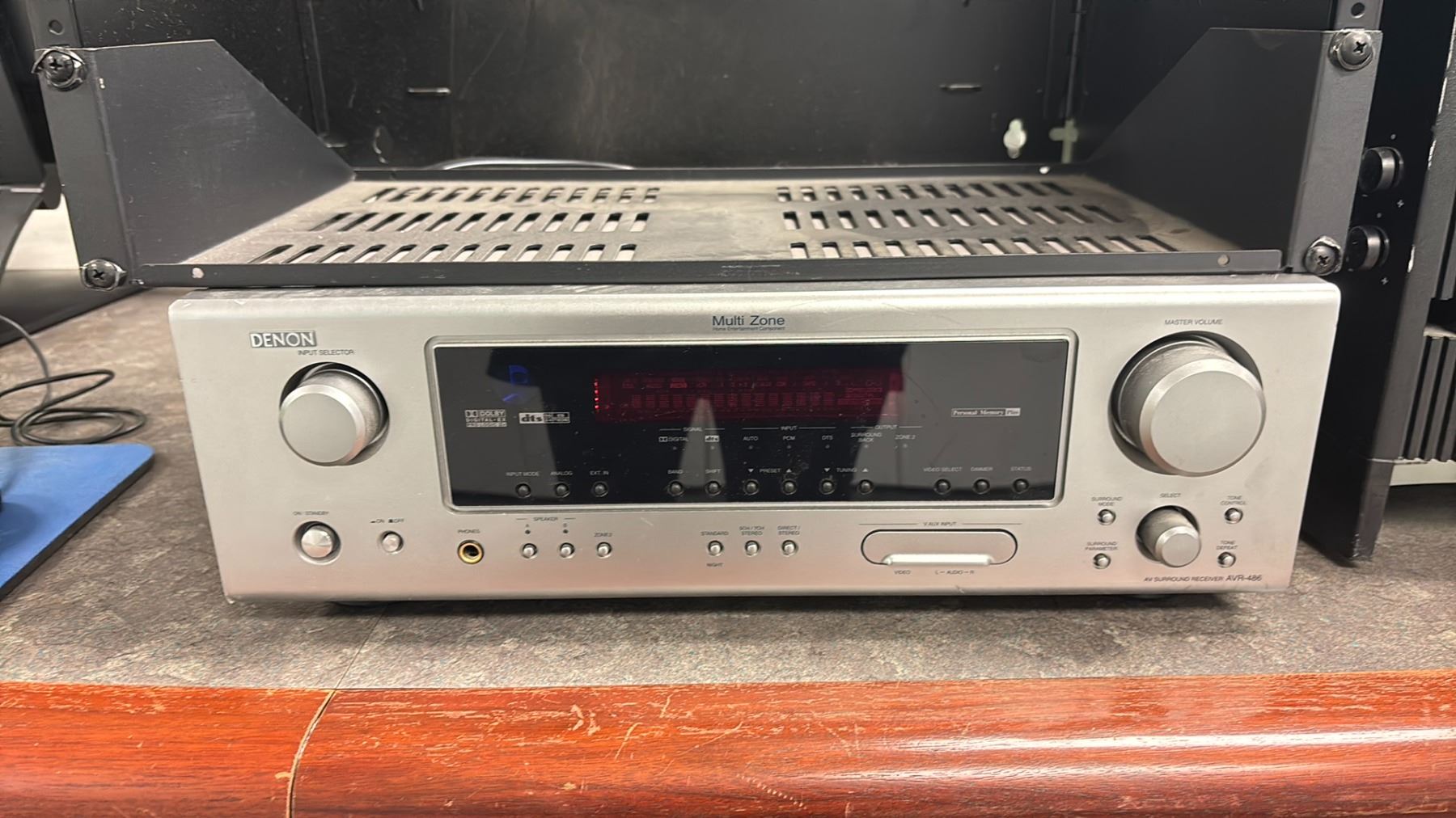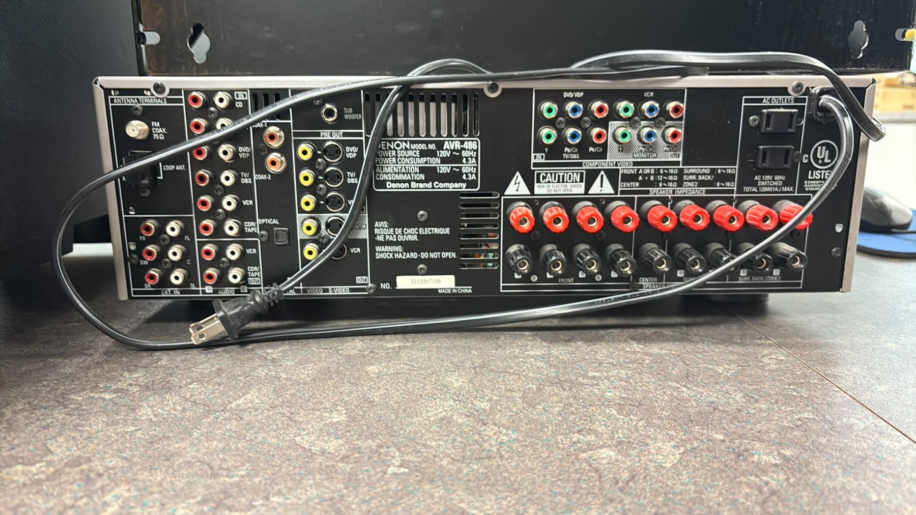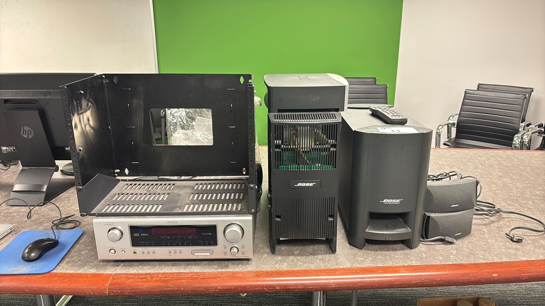 BOSE PS3-2-1 II POWERED SPEAKER SYSTEM, BOSE BASS, PAIR OF SMALL BOSE SPEAKERS WITH CORDS, BOSE CONTROL MODULE FOR SPEAKER SYSTEM, BOSE REMOTE, BAG OF ASSORTED SIZE BOSE SPEAKERS, DENON MULTI ZONE HOME ENTERTAINMENT COMPONENT & A BLACK WALL MOUNT