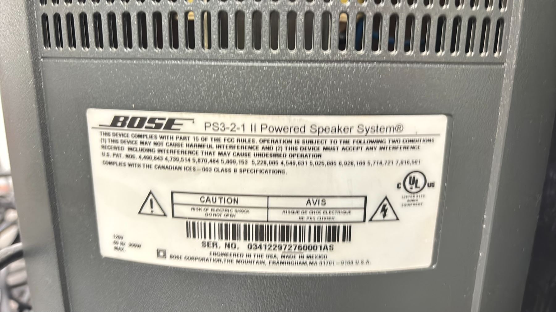 BOSE PS3-2-1 II POWERED SPEAKER SYSTEM, BOSE BASS, PAIR OF SMALL BOSE SPEAKERS WITH CORDS, BOSE