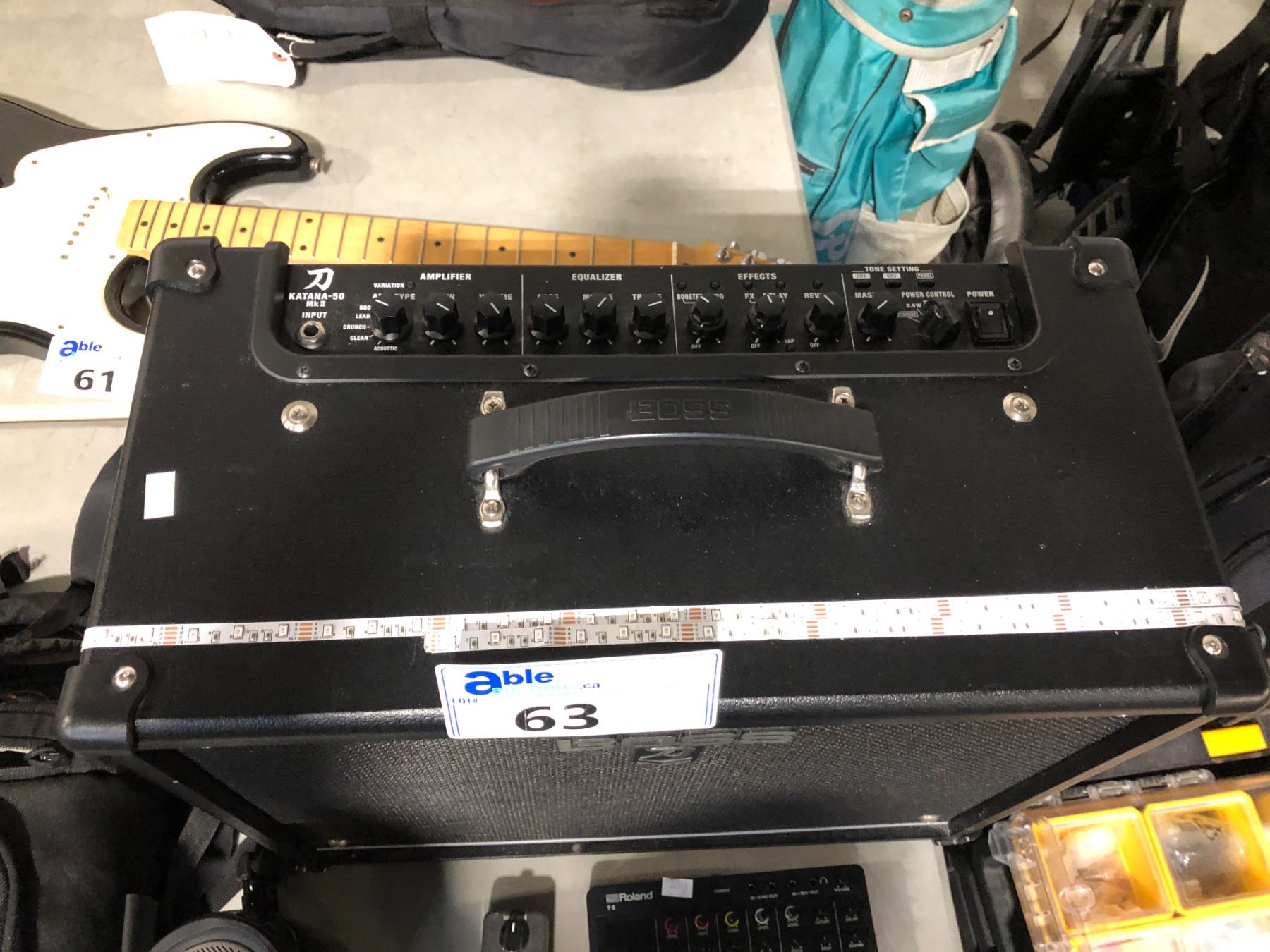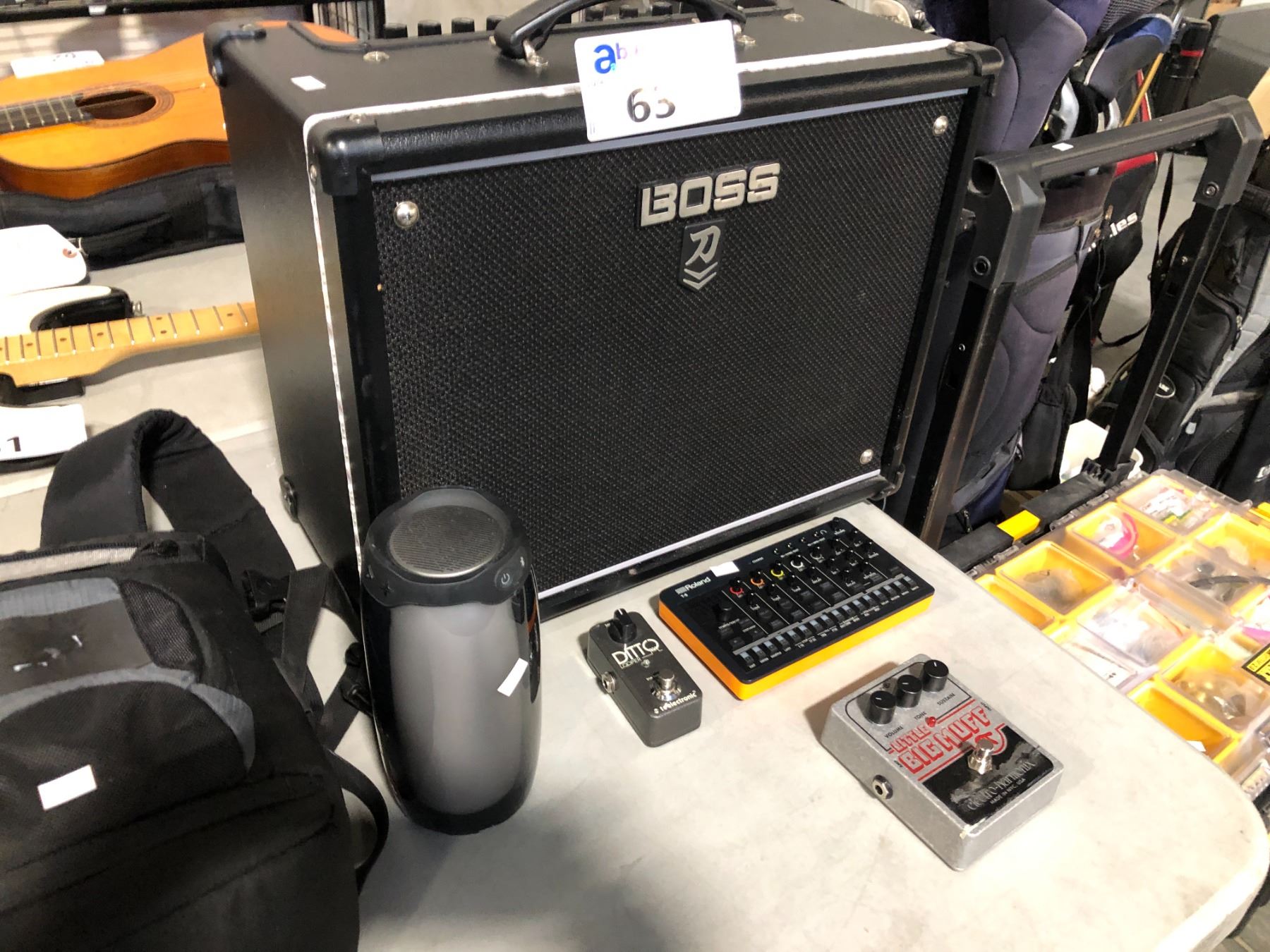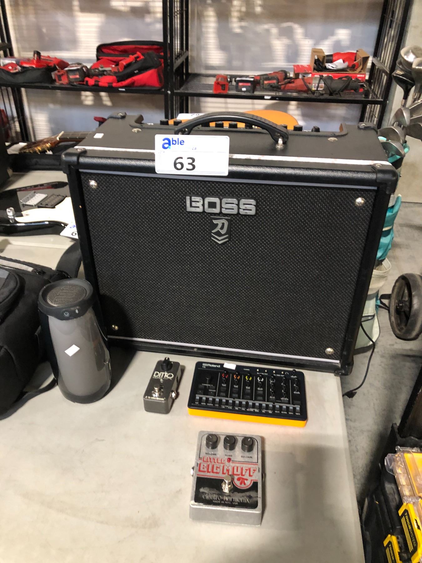 BOSS KATANA AMPLIFIER MDL:KTN-50 2, ROLAND T-8 BEAT MACHINE, LITTLE BIG MUFF ELECTRO HARMONIX, DITTO LOOPER TC ELECTRONIC GUITAR PEDALS AND JBL PULSE BLUETOOTH SPEAKER