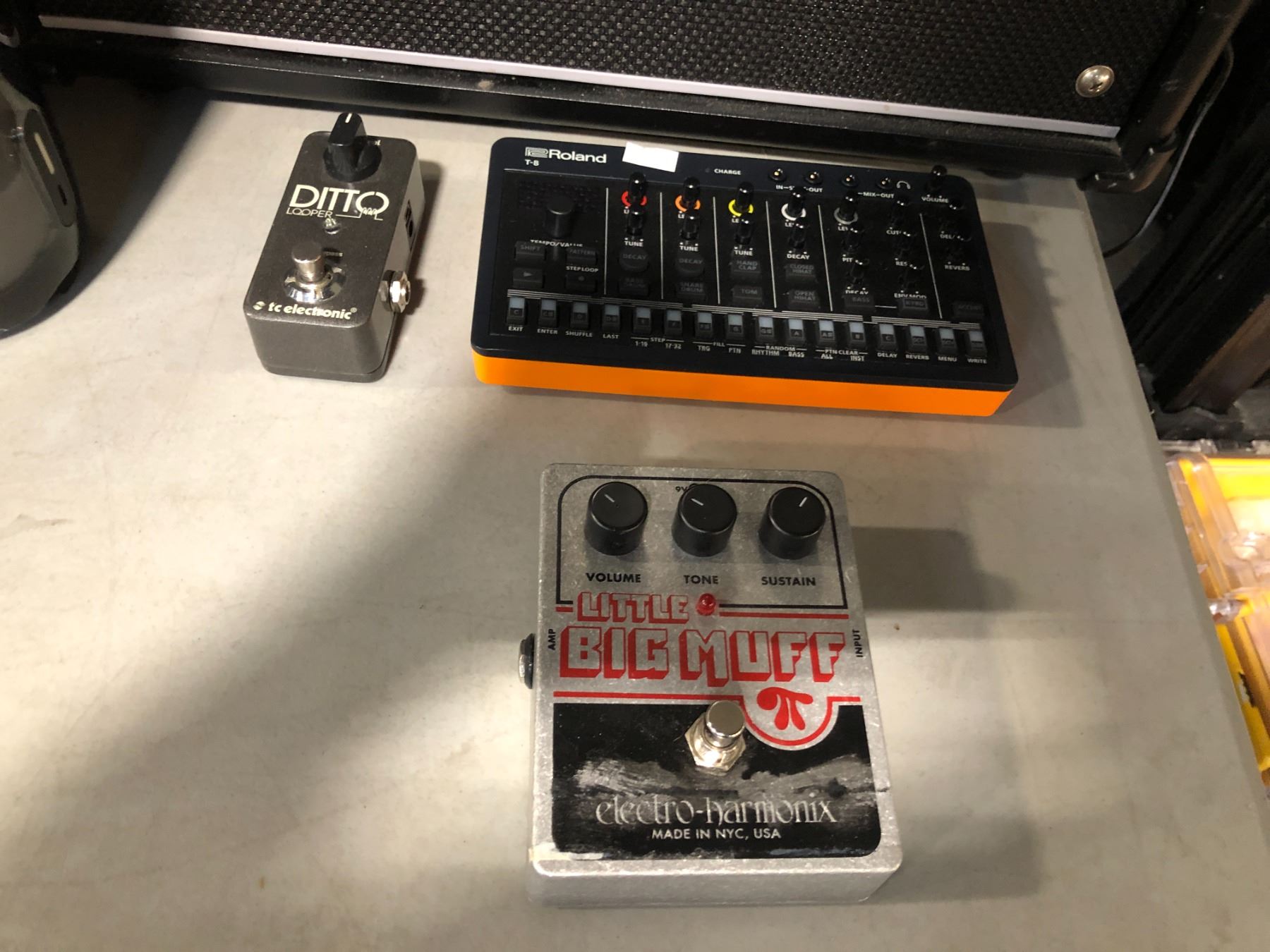 BOSS KATANA AMPLIFIER MDL:KTN-50 2, ROLAND T-8 BEAT MACHINE, LITTLE BIG MUFF ELECTRO HARMONIX,