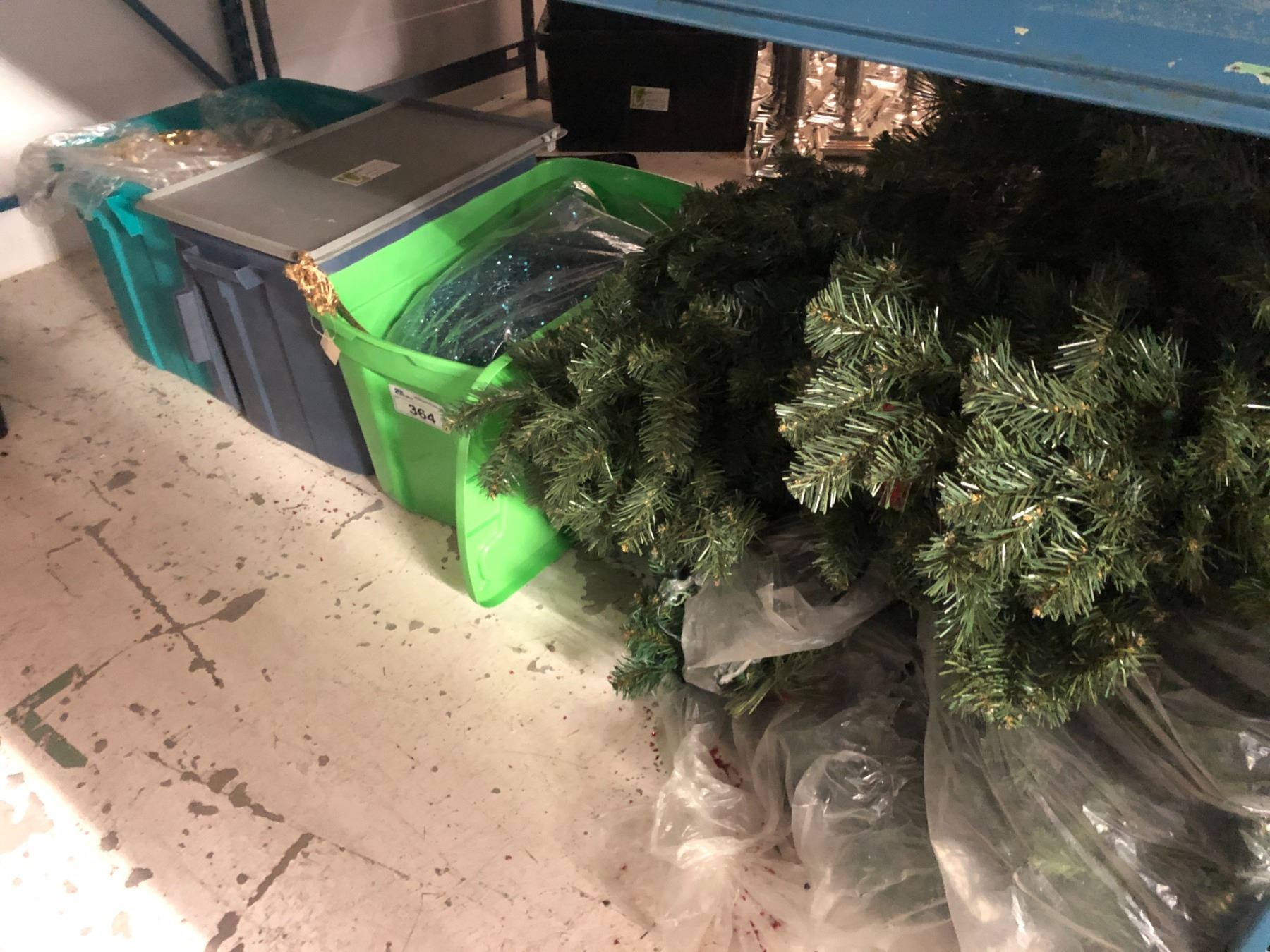 BOTTOM SHELF LOT OF ASSORTED CHRISTMAS DECOR INC. TREES, GARLANDS, WREATHS AND MORE