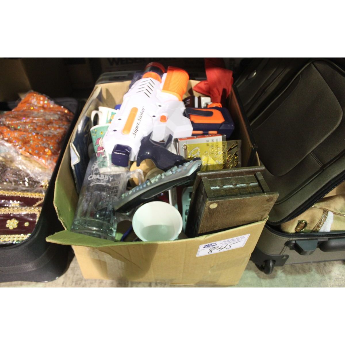 BOX AND SUITCASE OF MISCELLANEOUS HOUSEHOLD ITEMS