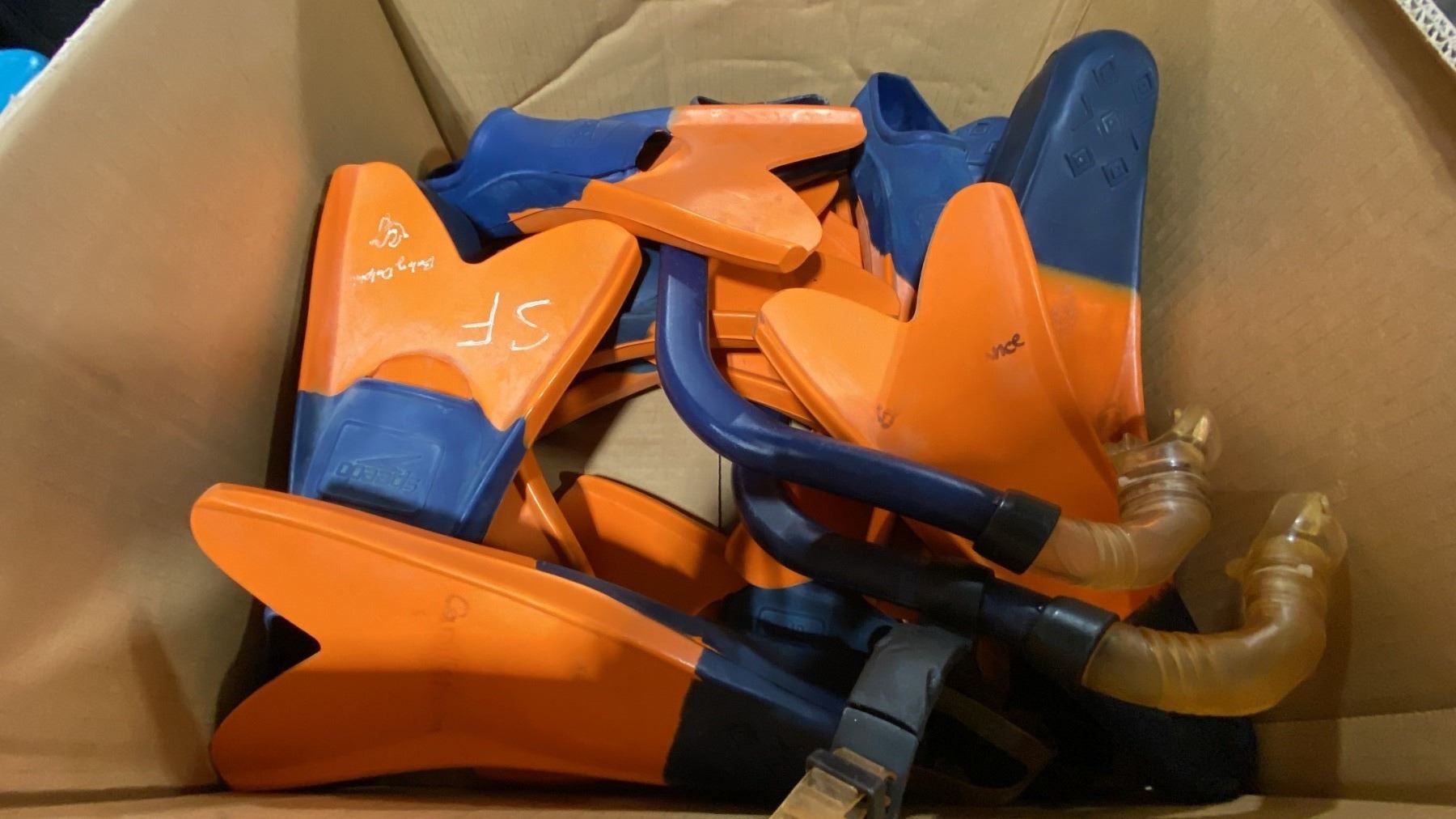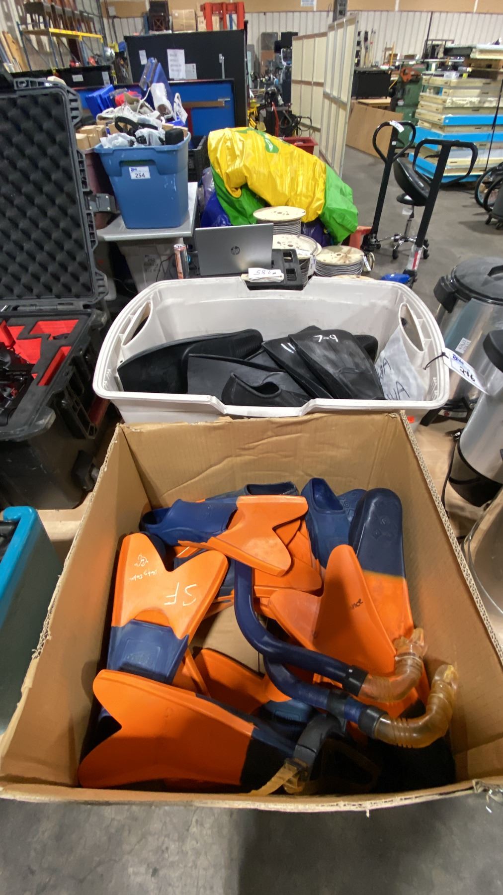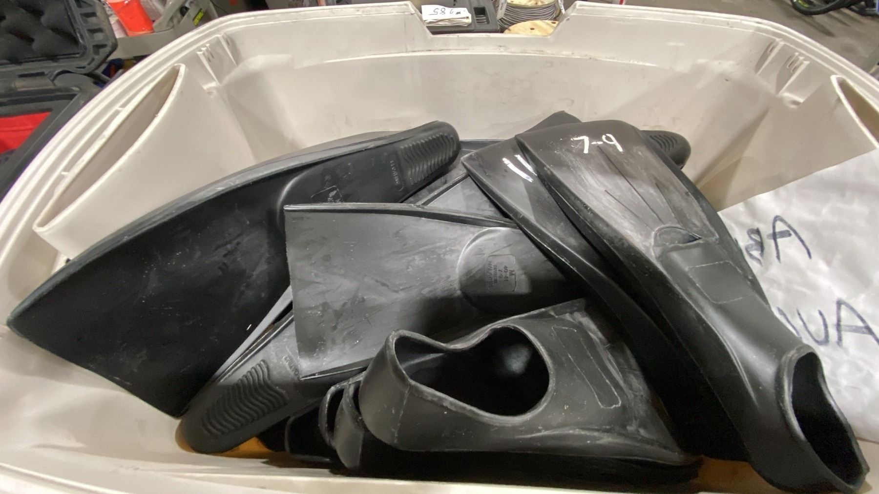 BOX & BIN OF ASSORTED CHILDRENS RUBBER FLIPPERS / SNORKELS *BIN INCLUDED*