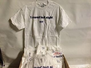 BOX CONTAINING APROX. 39 CCM HOCKEY T-SHIRTS WITH THE SAYING 'I SCORED LAST NIGHT' VARIOUS SIZES