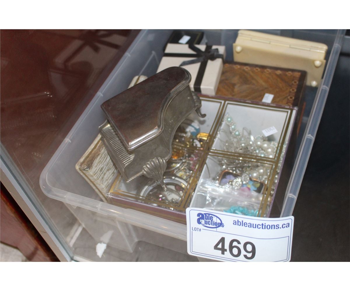 BOX FULL OF ASSORTED JEWELLERY; PINS, BROOCHES, NECKLACES, ETC