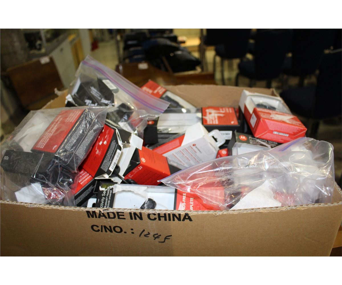 BOX FULL OF ASSORTED MOTOROLLA ACCESSORIES; VEHICLE POWER ADAPTERS, BLUTOOTH HEADSETS, ETC