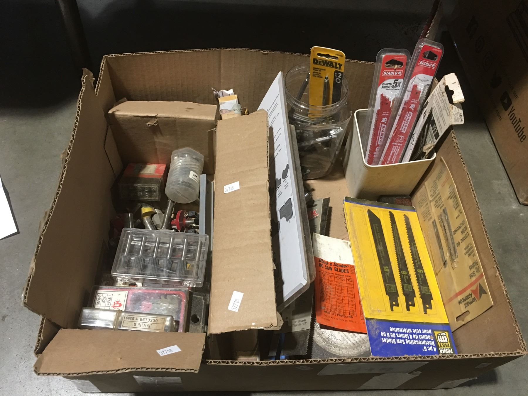 BOX FULL OF ASSTD SAW-BLADES, ROUTER BITS & DRIVER BITS