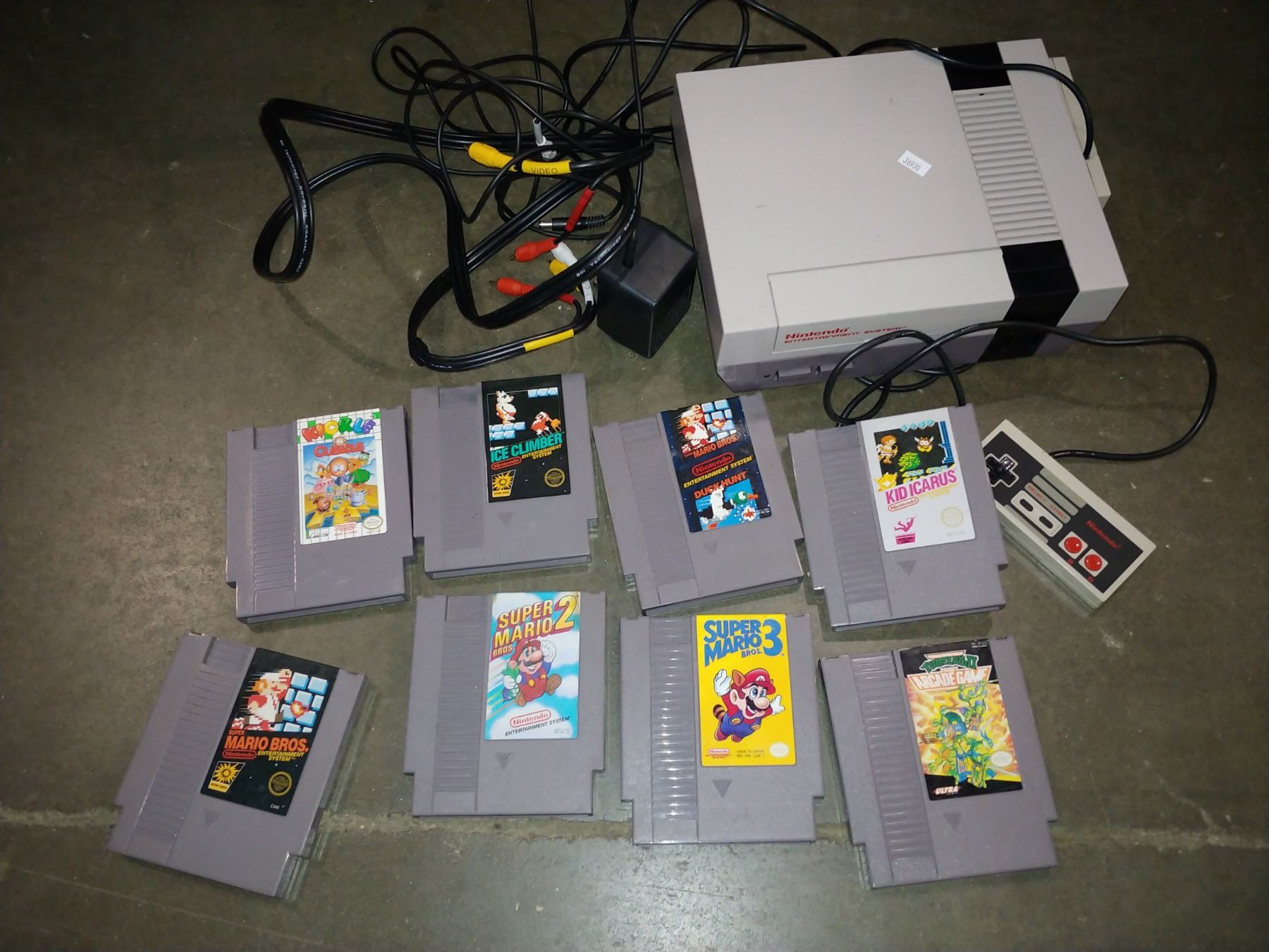 BOX INCLUDING NINTENDO ENTERTAINMENT SYSTEM WITH GAMES AND REMOTES