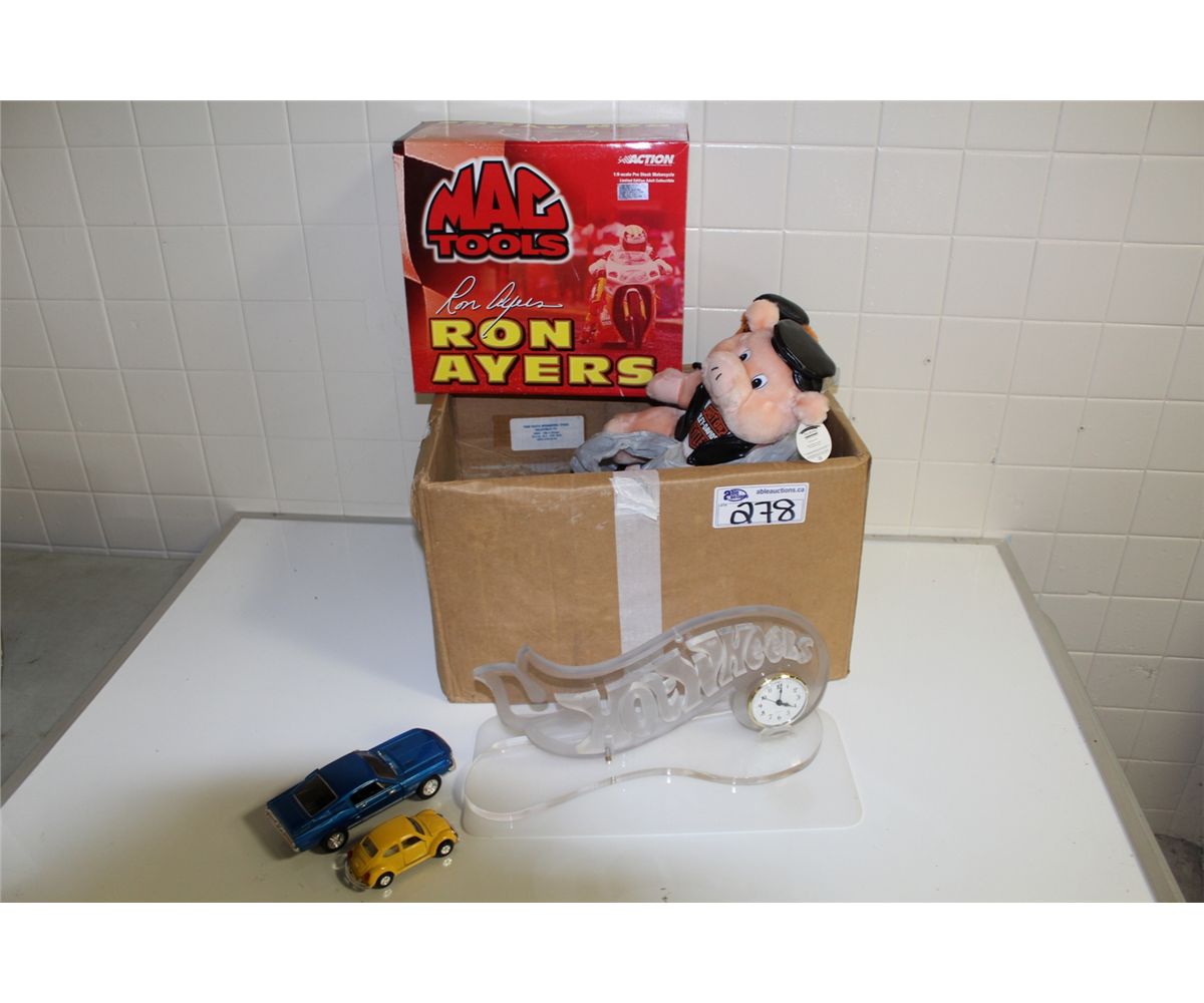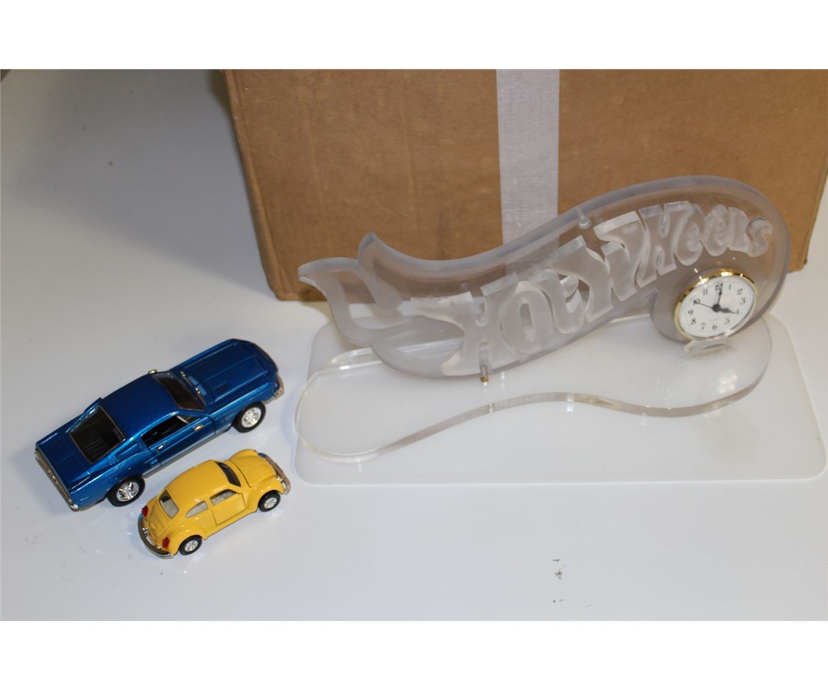 BOX LOT OF ASSORTED LOOSE DIE CAST, PLUSH TOYS, HOT WHEELS LOGO WITH CLOCK AND LOOSE HOT WHEELS