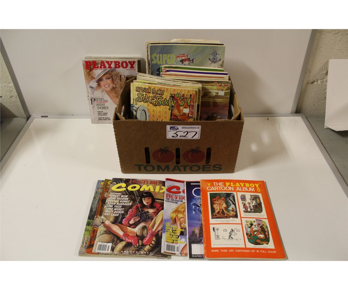 BOX LOT OF ASSORTED VINTAGE PLAYBOY MAGAZINES AND COMICS, 18+
