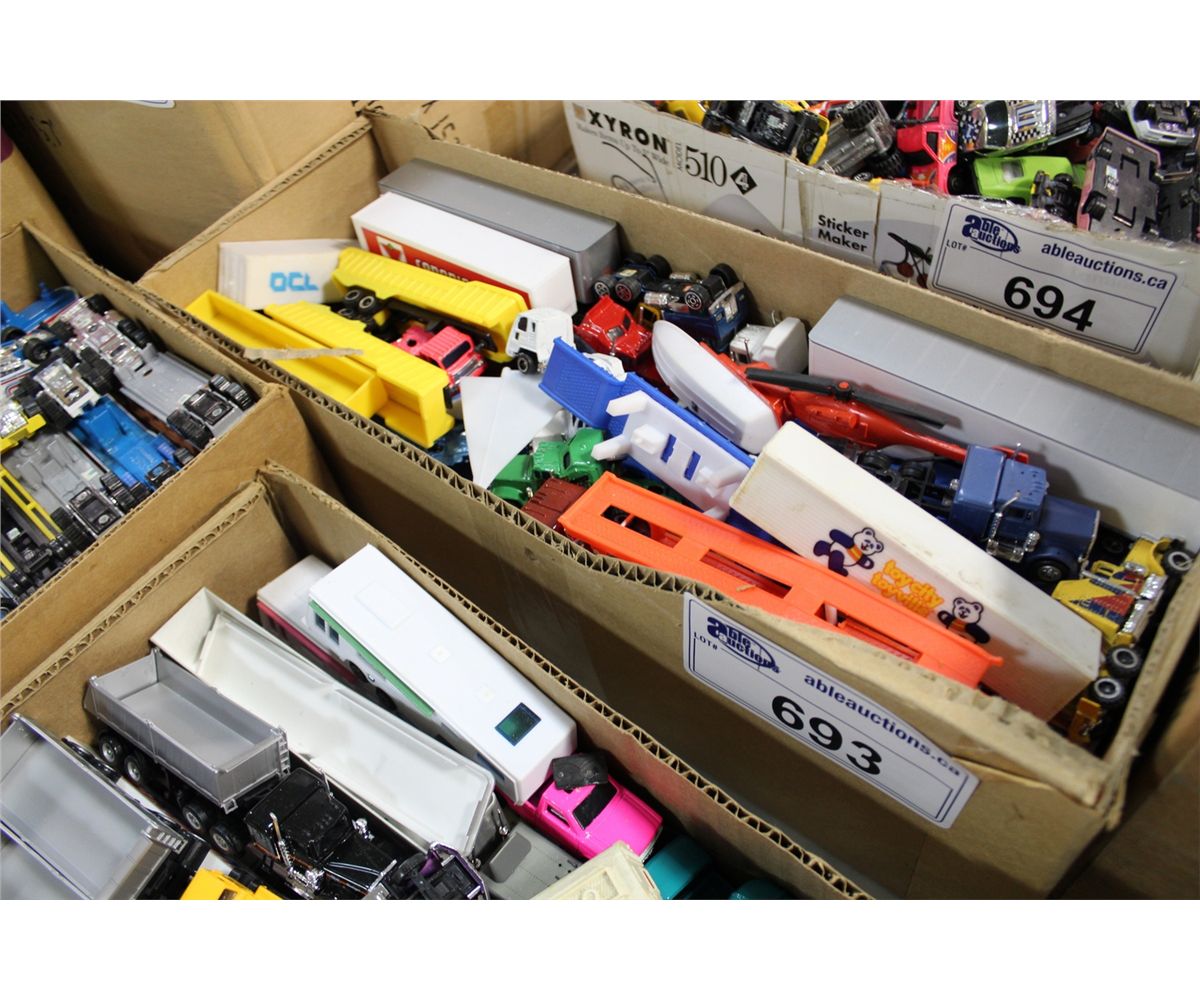 BOX LOT OF VINTAGE TO NEWER DIE CAST TRUCKS AND MORE