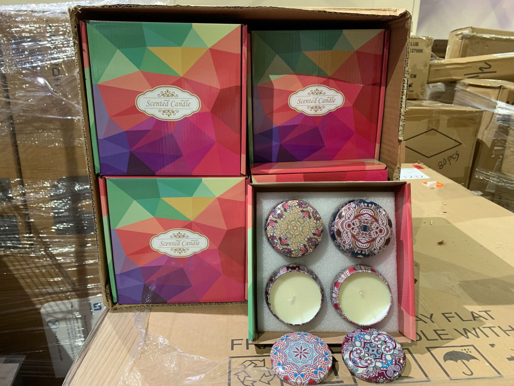 BOX OF APPROX 20, 4 PIECE CANDLE SET, SCENTS INCLUDE; VANILLA, LAVENDER, JASMINE AND SANDALWOOD