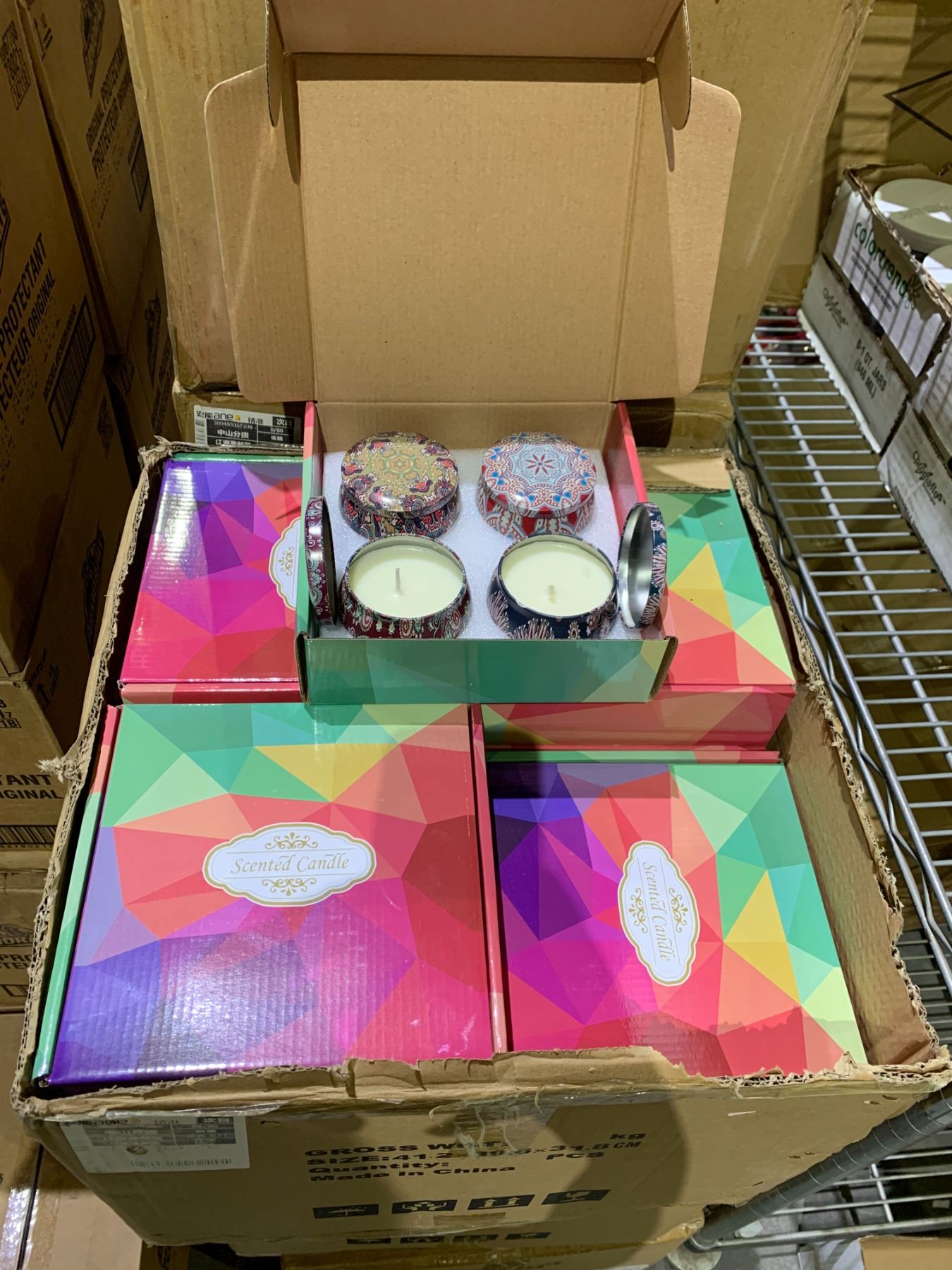 BOX OF APPROX 20, 4 PIECE CANDLE SET, SCENTS INCLUDE; VANILLA, LAVENDER, JASMINE AND SANDALWOOD