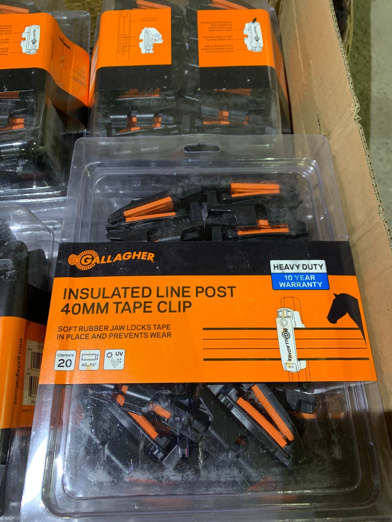BOX OF APPROX 20 CONTAINERS OF GALLAGHER INSULATED LINE POST 40MM TAPE CLIP