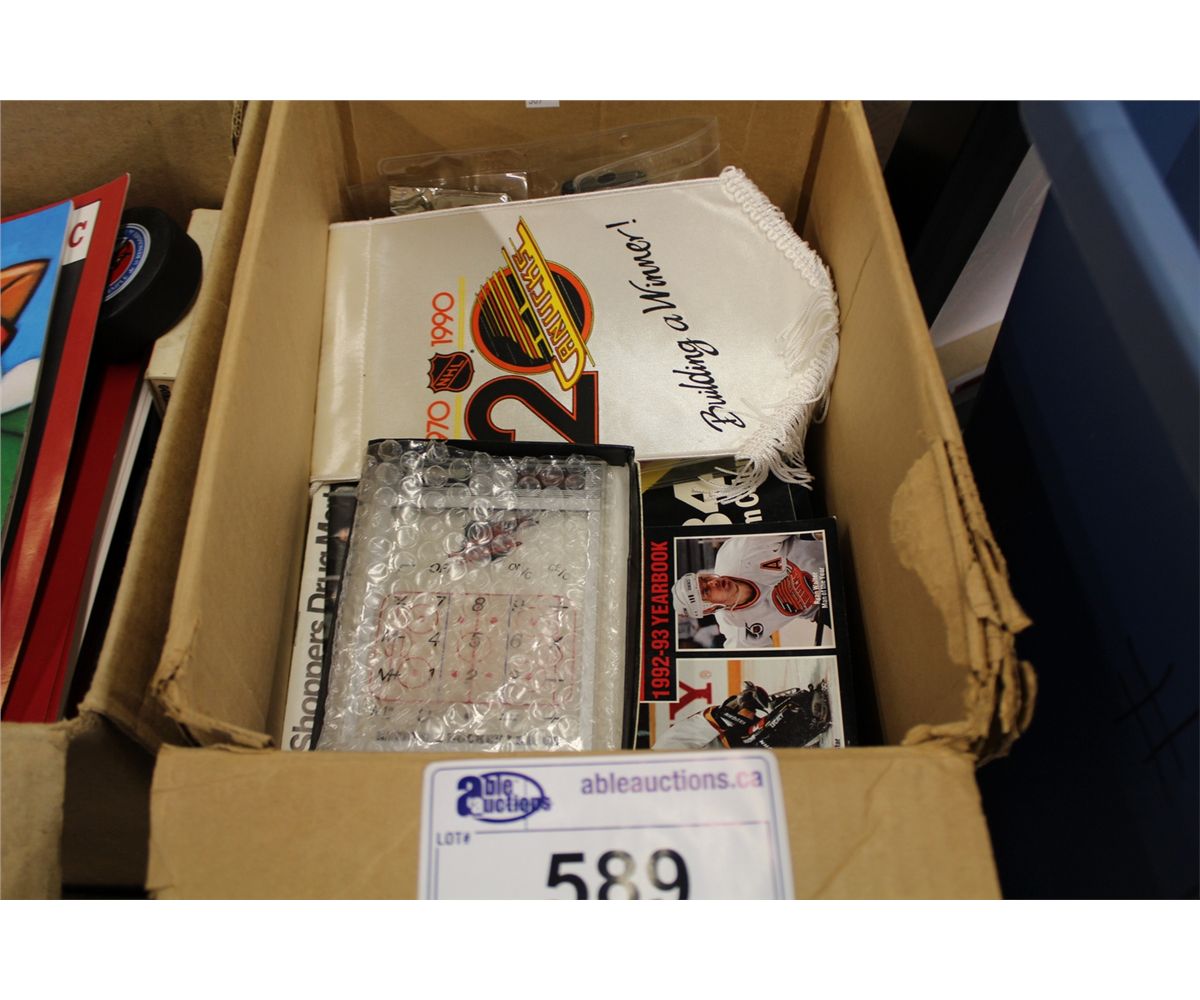 BOX OF ASSORTED 1980'S- 90'S CANUCKS COLLECTABLES INCL. CALENDARS, BANNERS ETC.