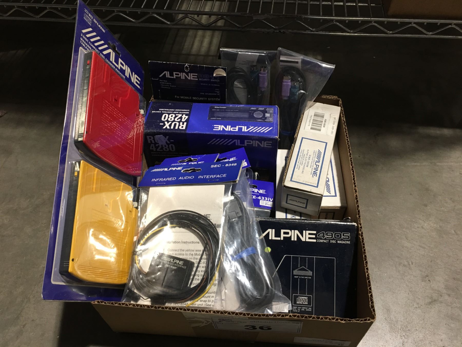 BOX OF ASSORTED ALPINE CAR AUDIO ELECTRONIC ACCESSORIES