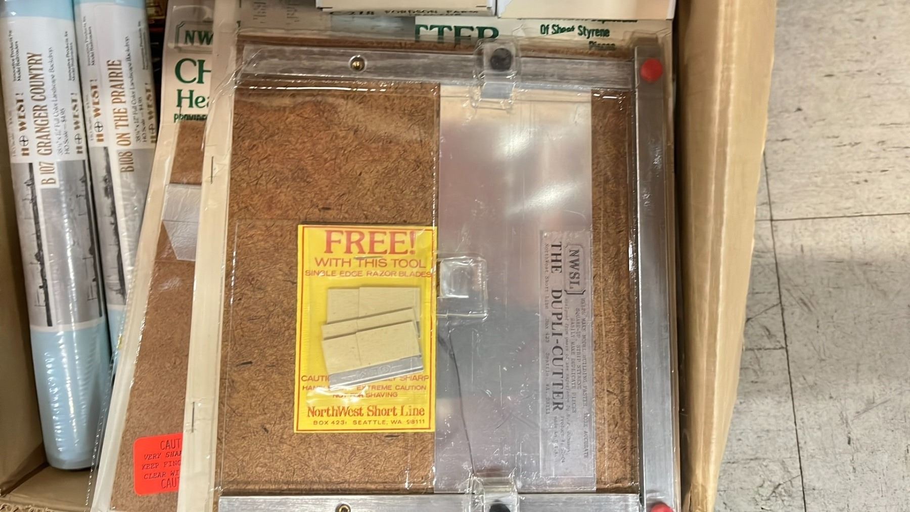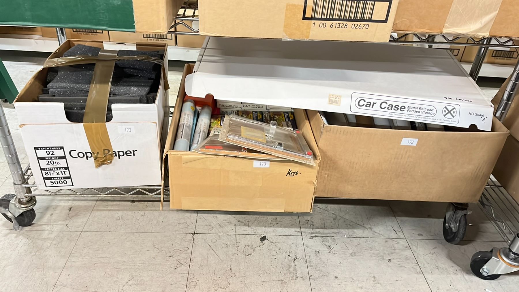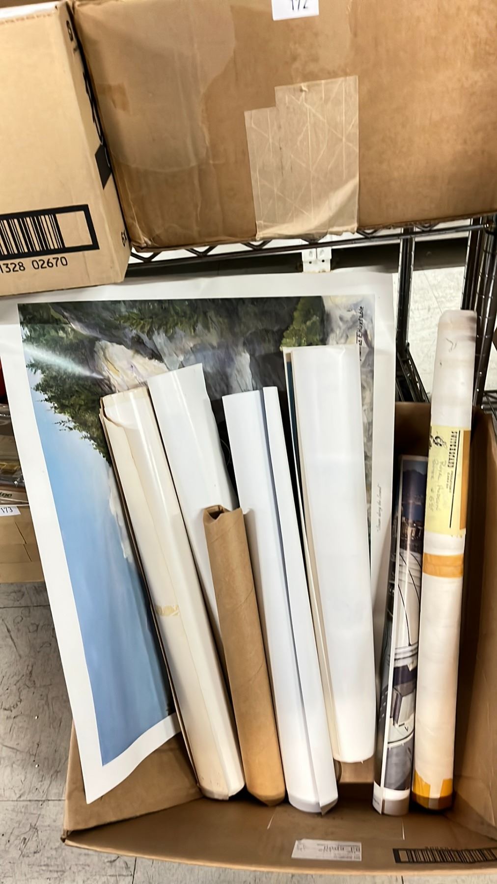 BOX OF ASSORTED ATHEARNS MINIATURE MODEL TRAINS, ASSORTED DECORATIVE VEHICLES, LANDSCAPE BACKDROPS, BOX OF FOAM, RAILROAD MODEL CARCASE & BOX OF POSTERS