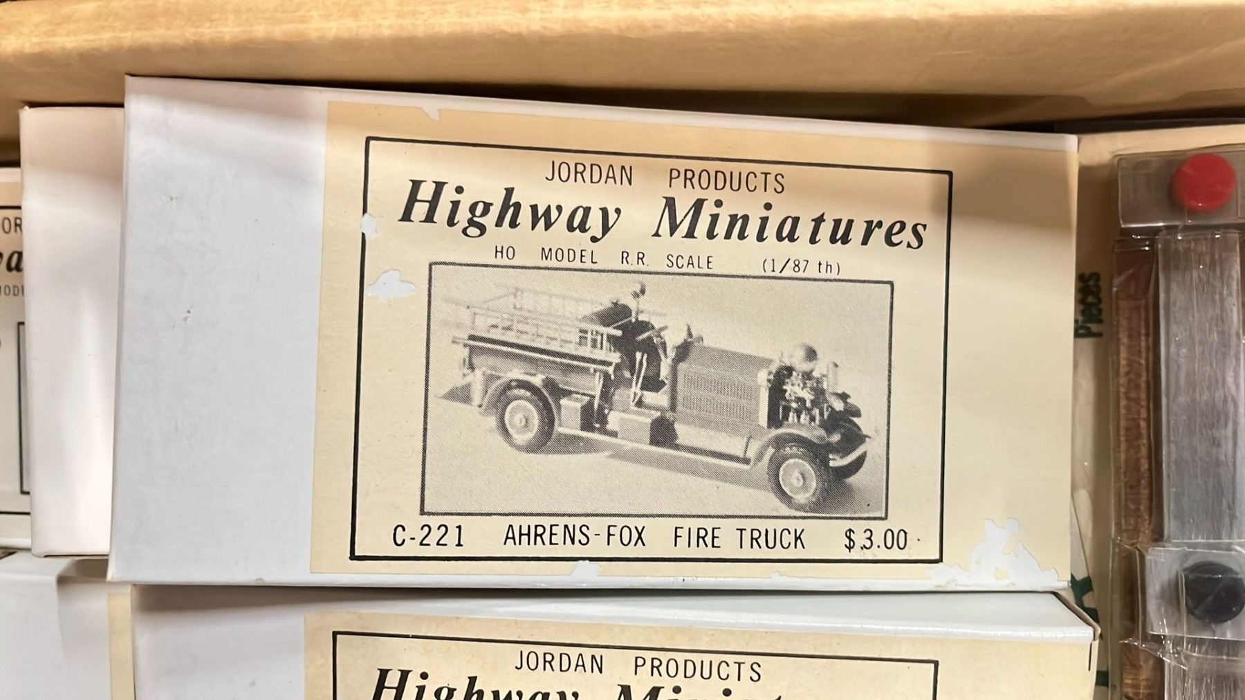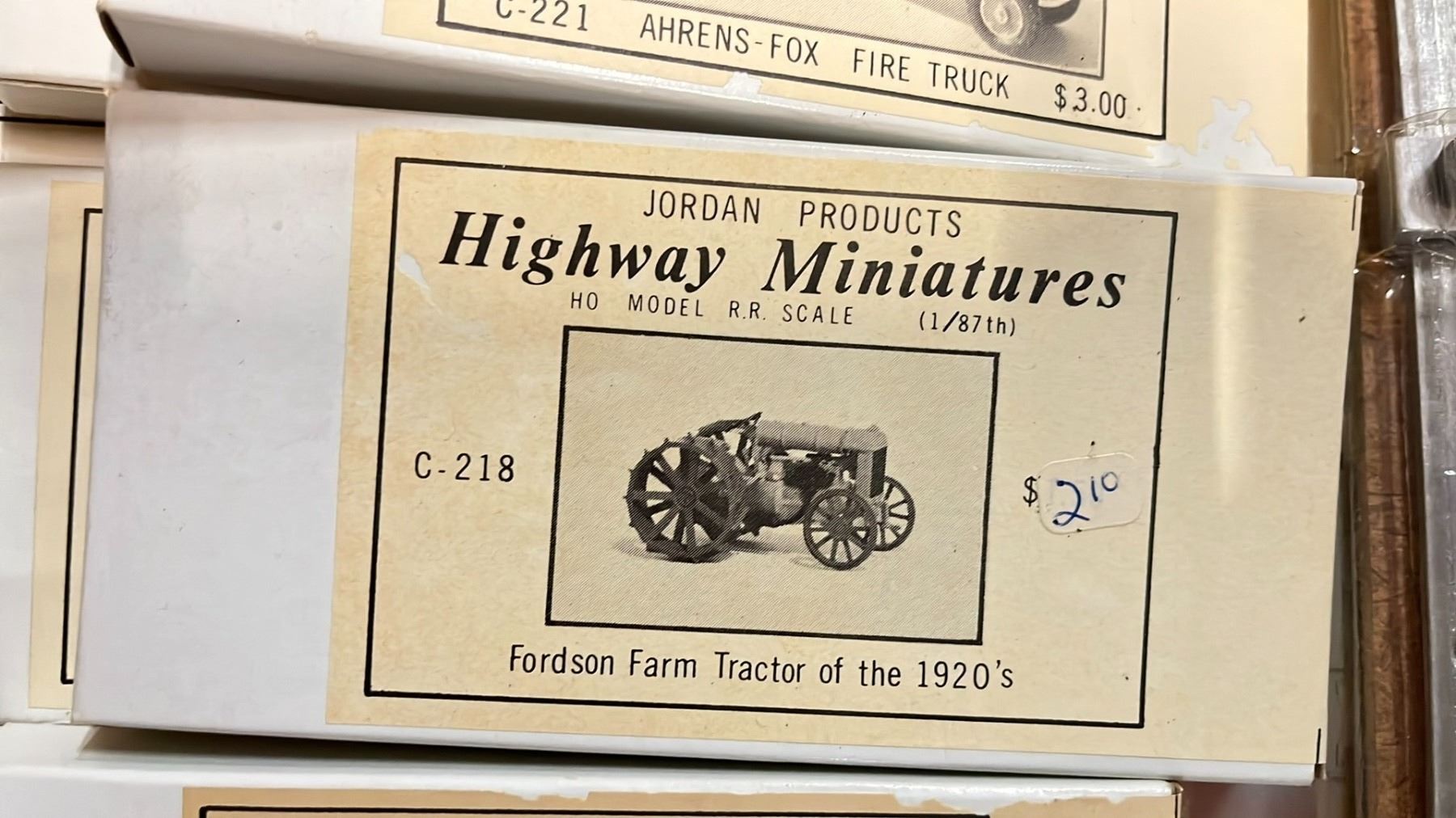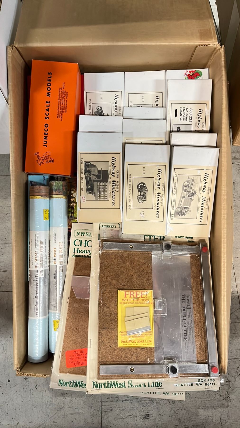 BOX OF ASSORTED ATHEARNS MINIATURE MODEL TRAINS, ASSORTED DECORATIVE VEHICLES, LANDSCAPE BACKDROPS,